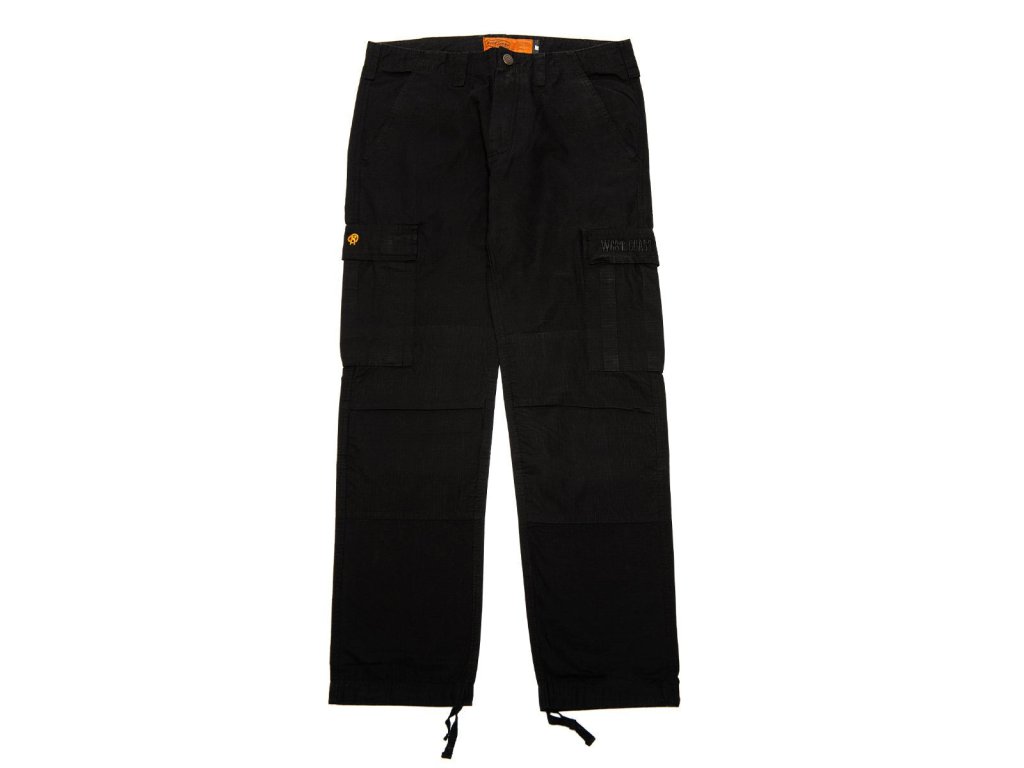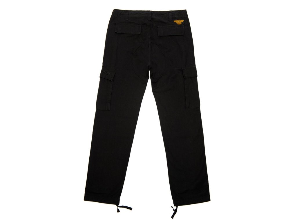Tyto cargo kalhoty West Coast Choppers mají v pase klasickou kombinaci knoflíku a zipu a navíc ještě i šňůrku. Dvě boční kapsy, dvě na bedrech a další na stehnech. Rovný střih nohavic se stahovací šňůrkou ve spodním lemu.