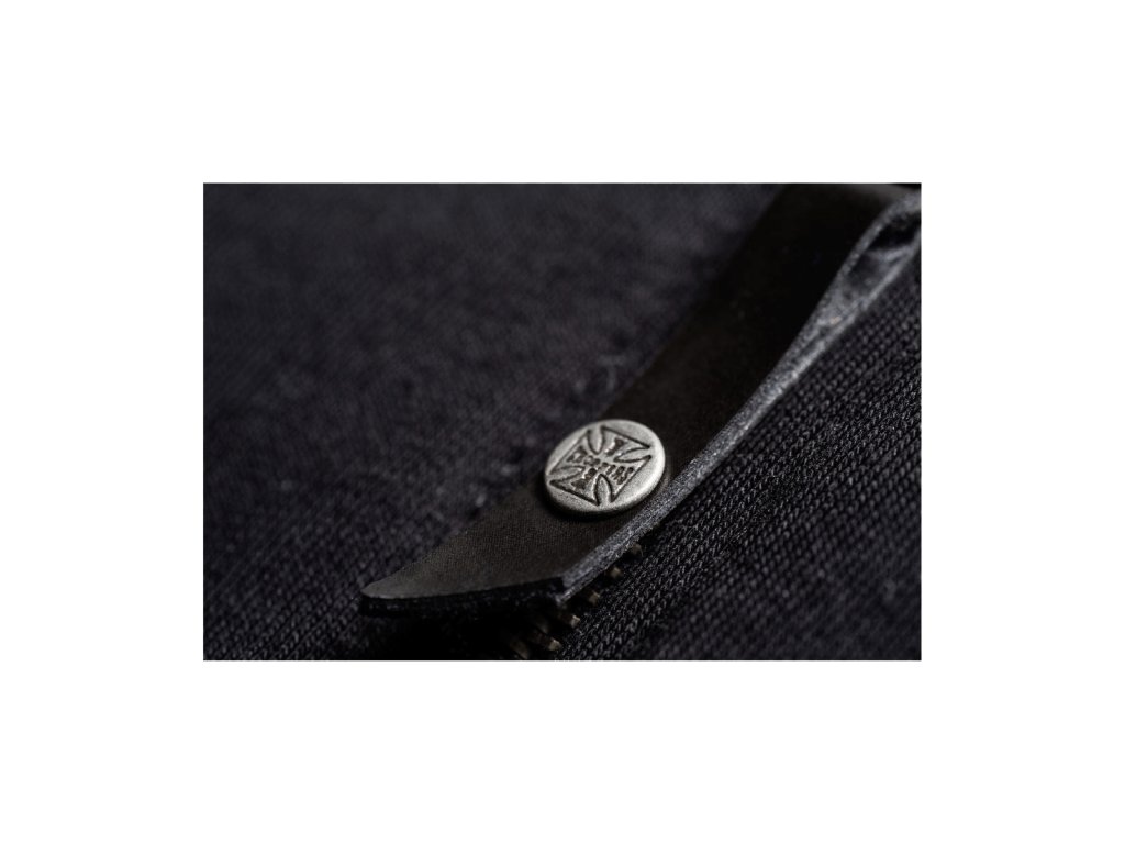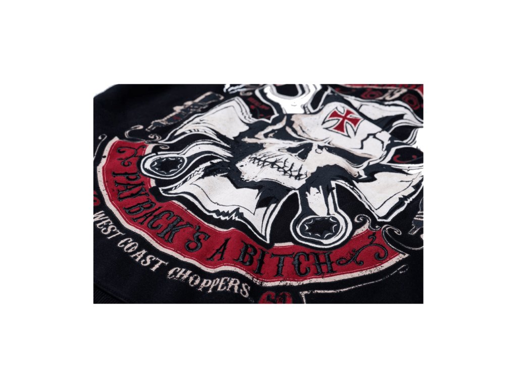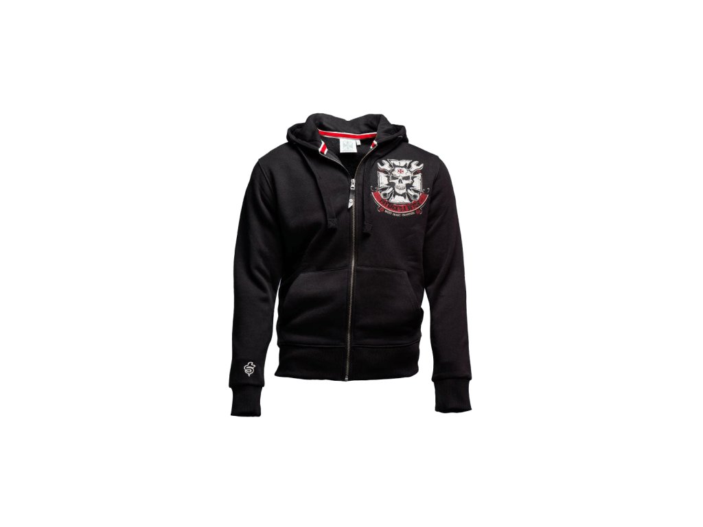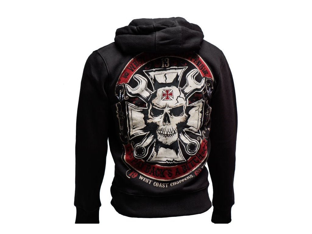 Černá pánská mikina West Coast Choppers na zip. Mikina má dvě boční kapsy, kapuci na šňůrku a potisk přes celé záda kombinaci potisku a výšivky skull mechanics.