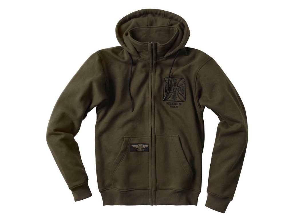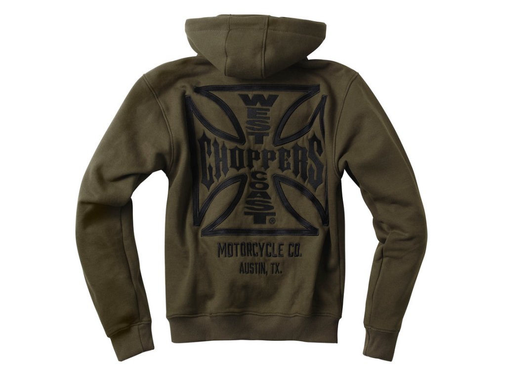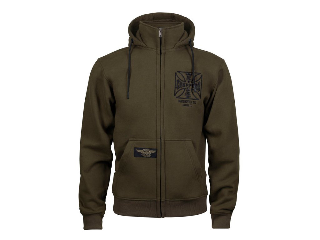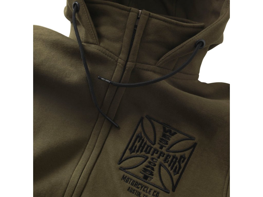 Olivová pánská mikina West Coast Choppers na zip. Mikina má dvě boční kapsy, kapuci na šňůrku a přes celé záda je výšivka WCC kříže. Materiál je vyšší gramáže 330g.