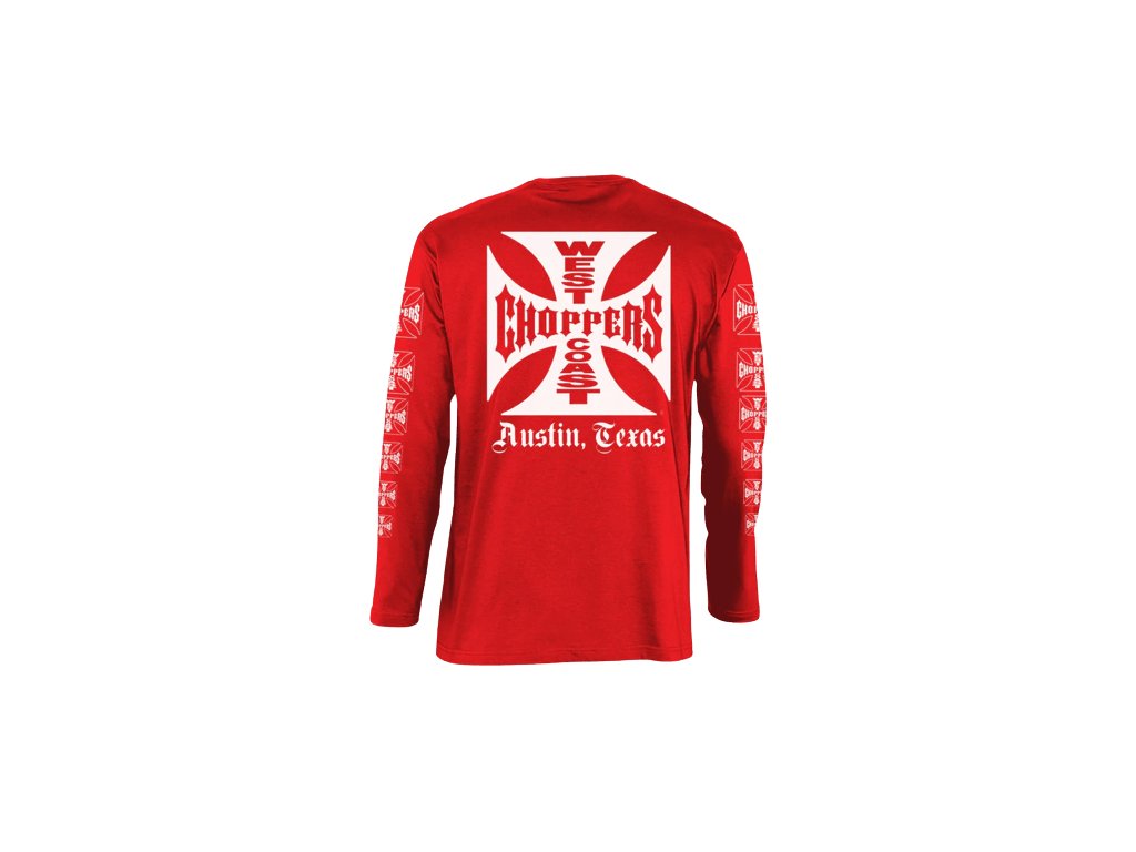 Červené pánské triko West Coast Choppers s dlouhým rukávem a s nápisem Austin, Texas na zadní straně.