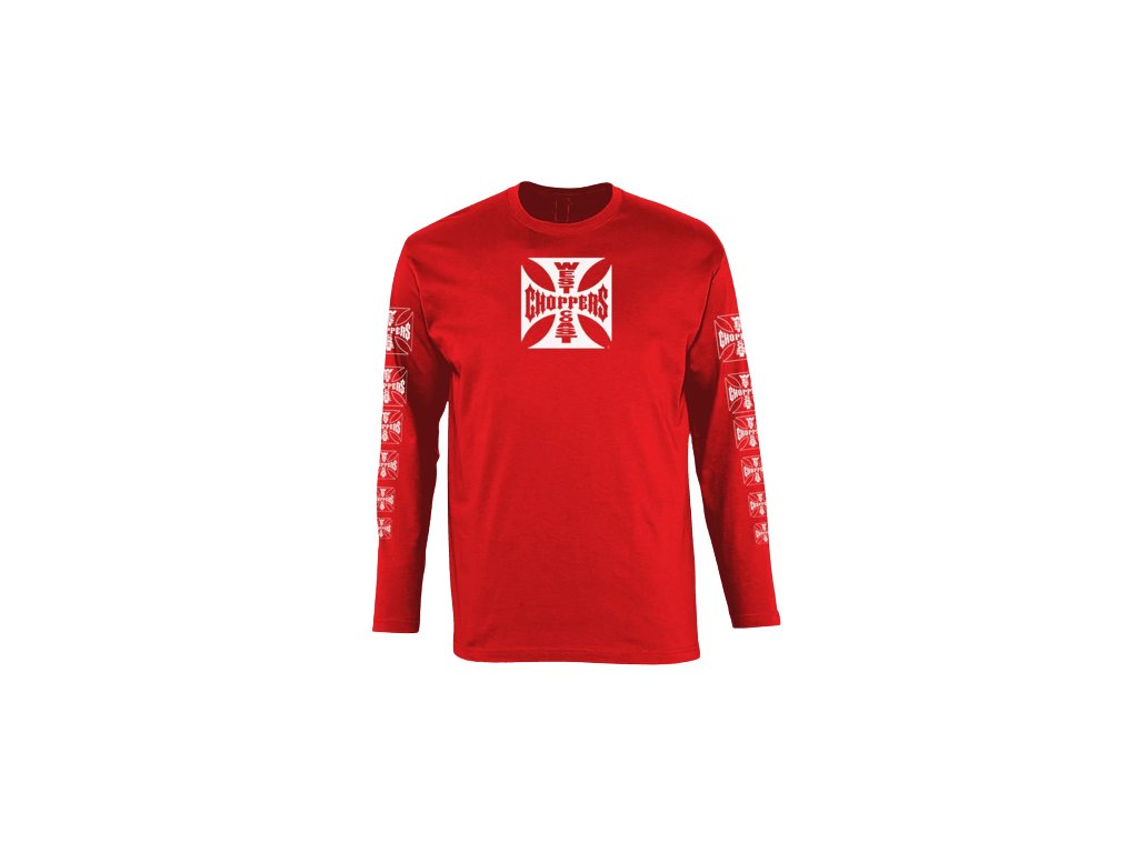 Červené pánské triko West Coast Choppers s dlouhým rukávem. Triko je vyrobeno z nejjemnější dostupné bavlny, má potisk OG kříže na přední i zadní straně a na rukávech.
