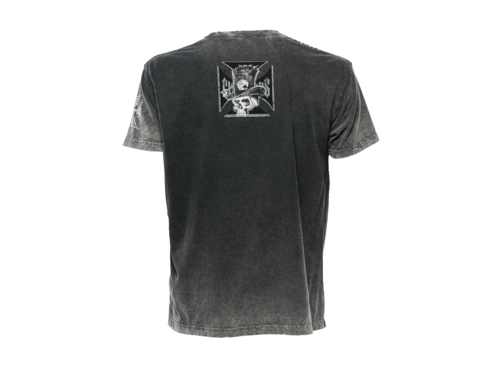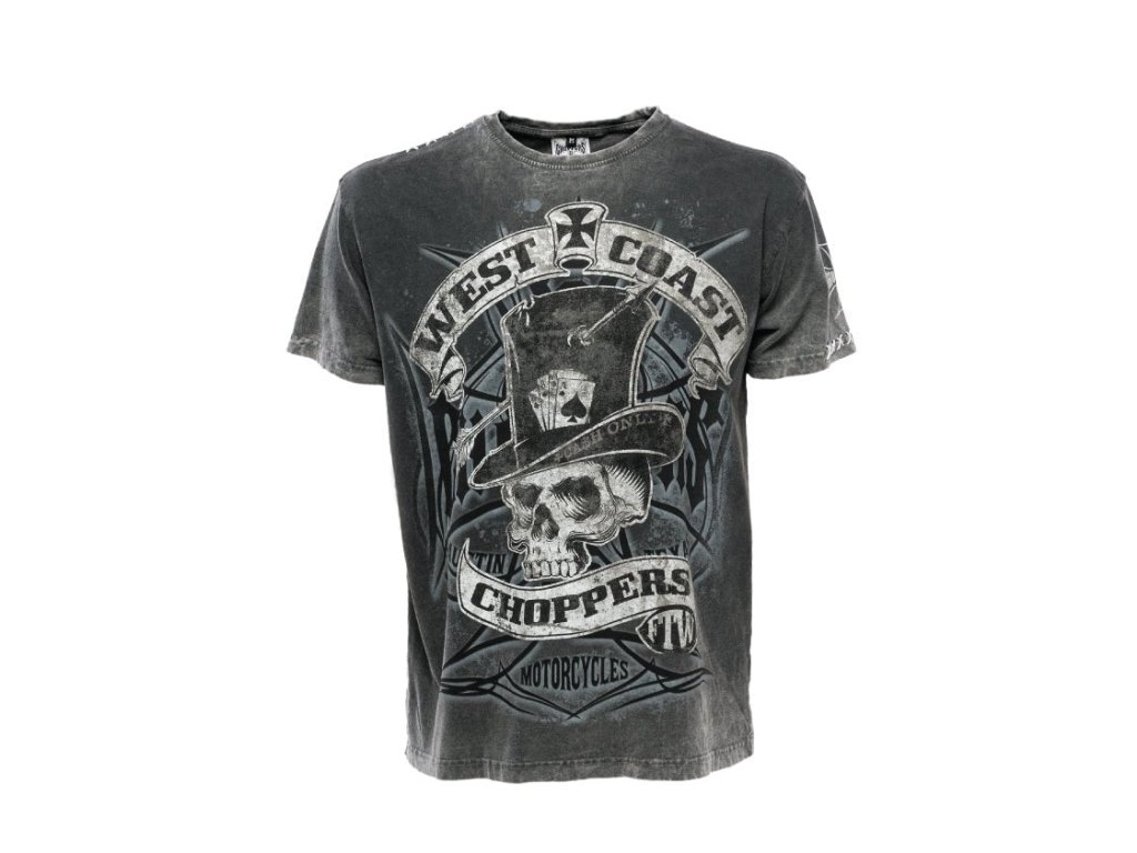 Černo-šedé pánské triko West Coast Choppers s krátkým rukávem. Toto triko má na přední na přední straně potisk lebky s cylindrem a na pravém rameni a levém rukávu je zajímavý detail prošití.