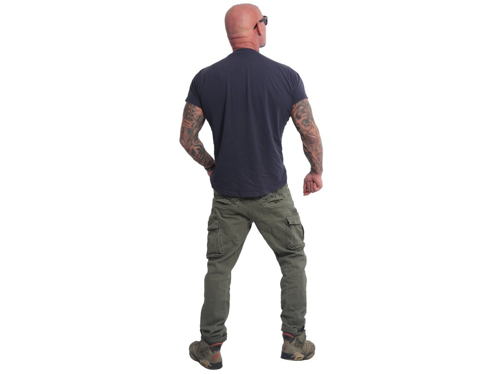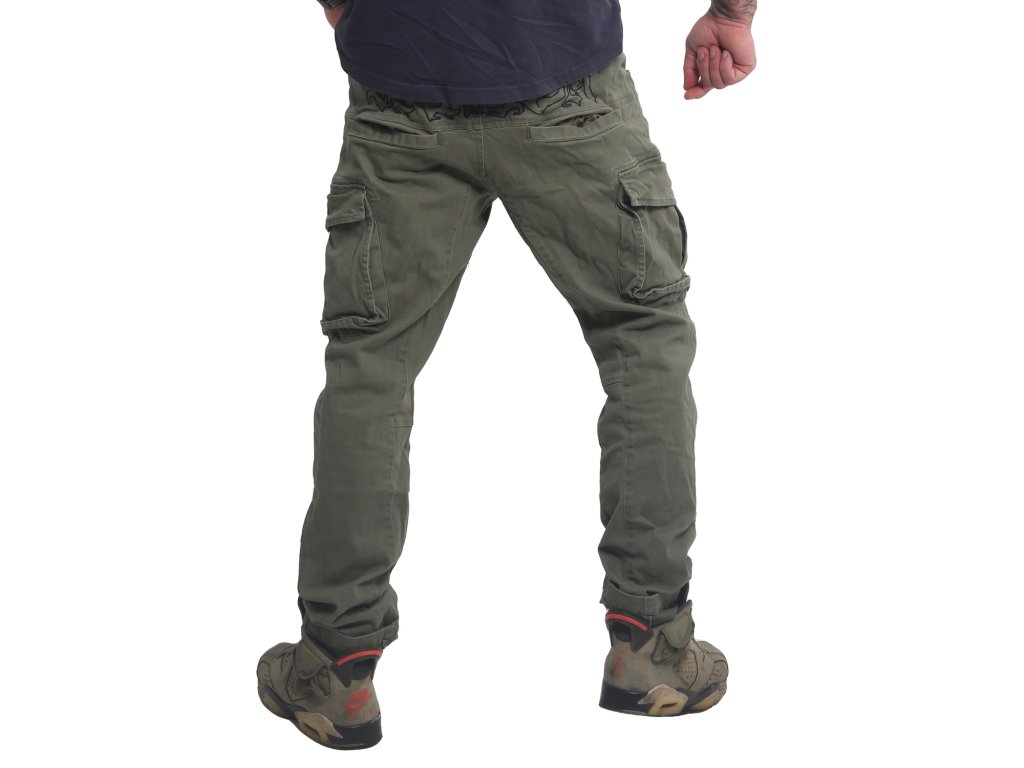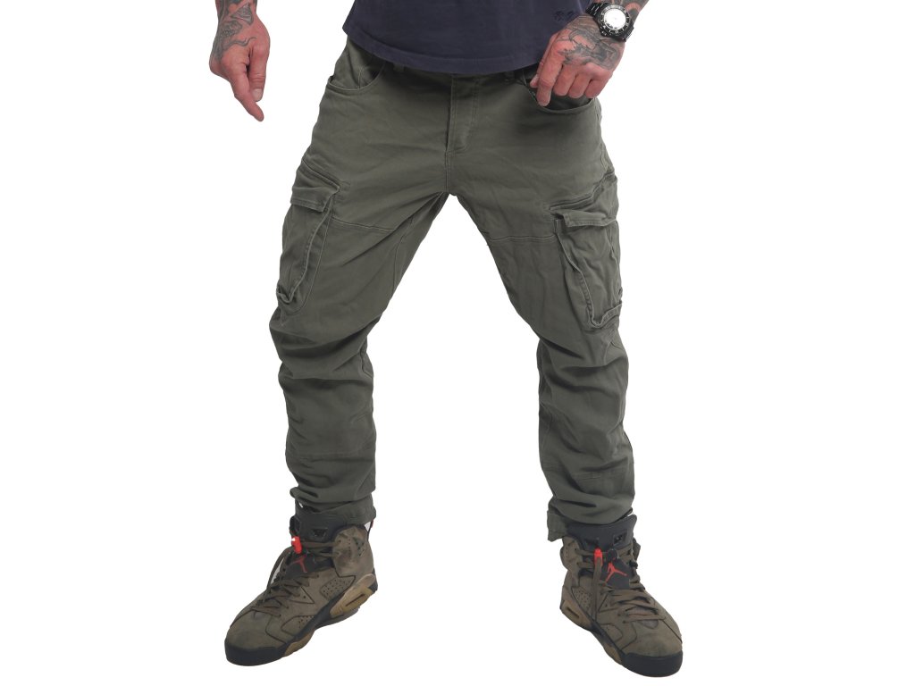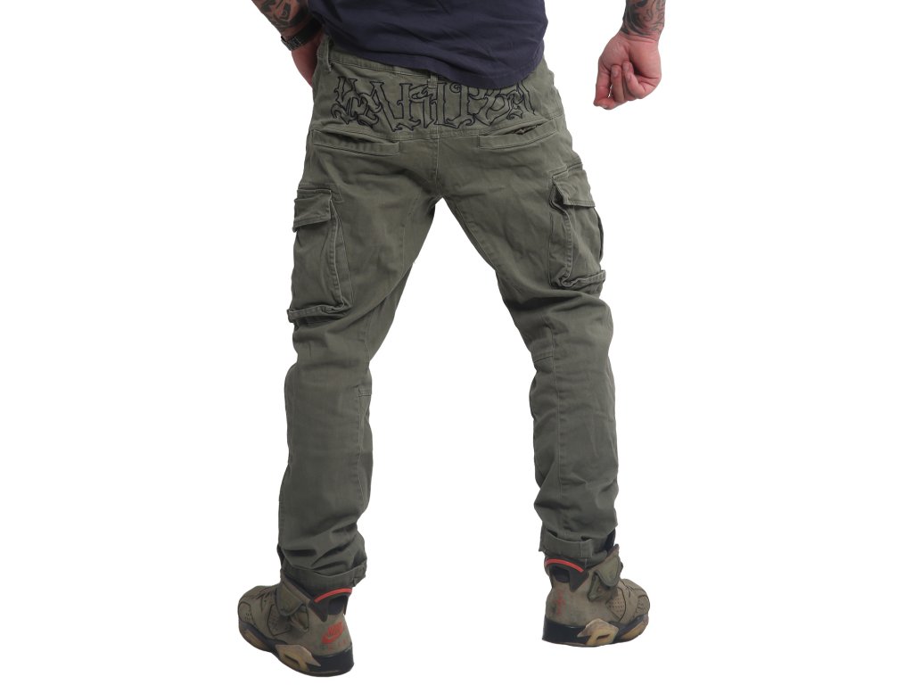 Pánské kalhoty Yakuza Ancient 22064 v olivové barvě. Kalhoty mají na bedrech černou výšivku YAKUZA, 4 přední a 2 zadní kapsy. U kotníků jsou rovně střižené. Model je vysoký 1,82m a nosí velikost W32.