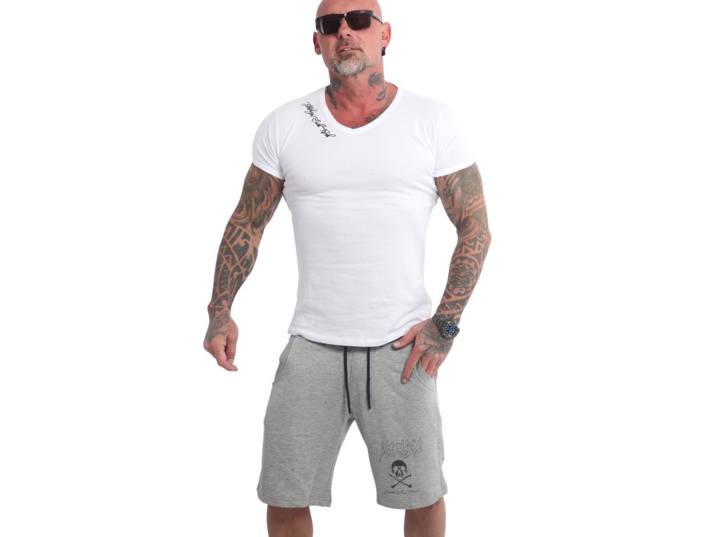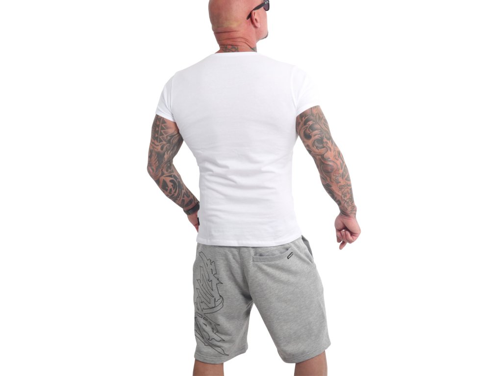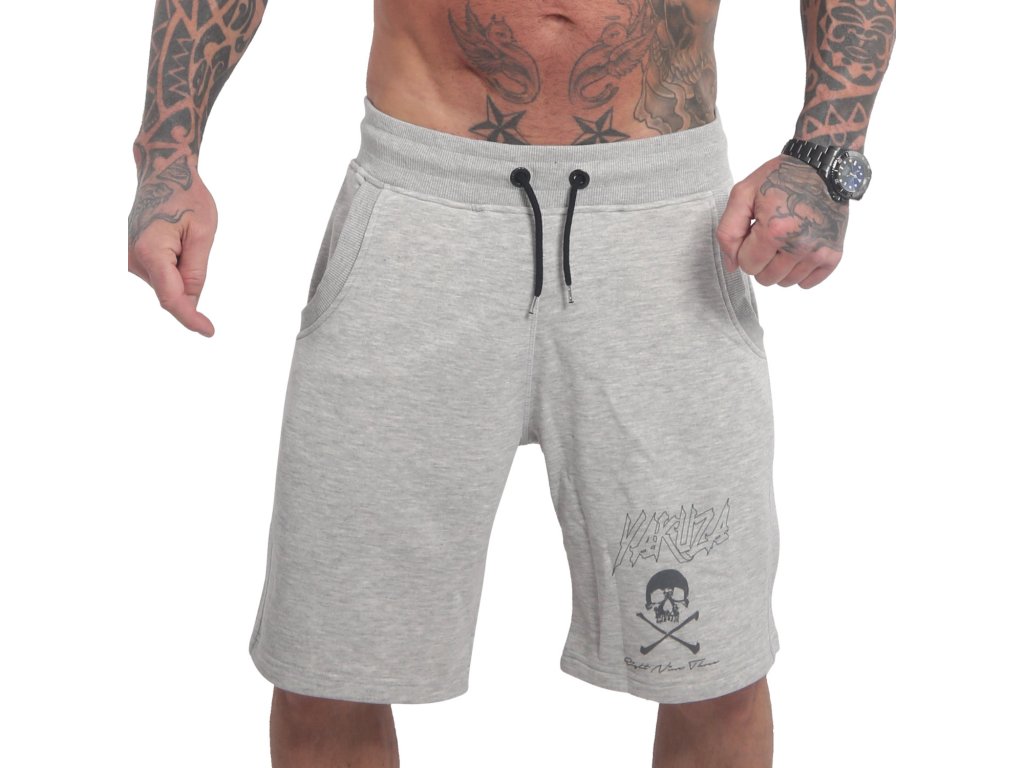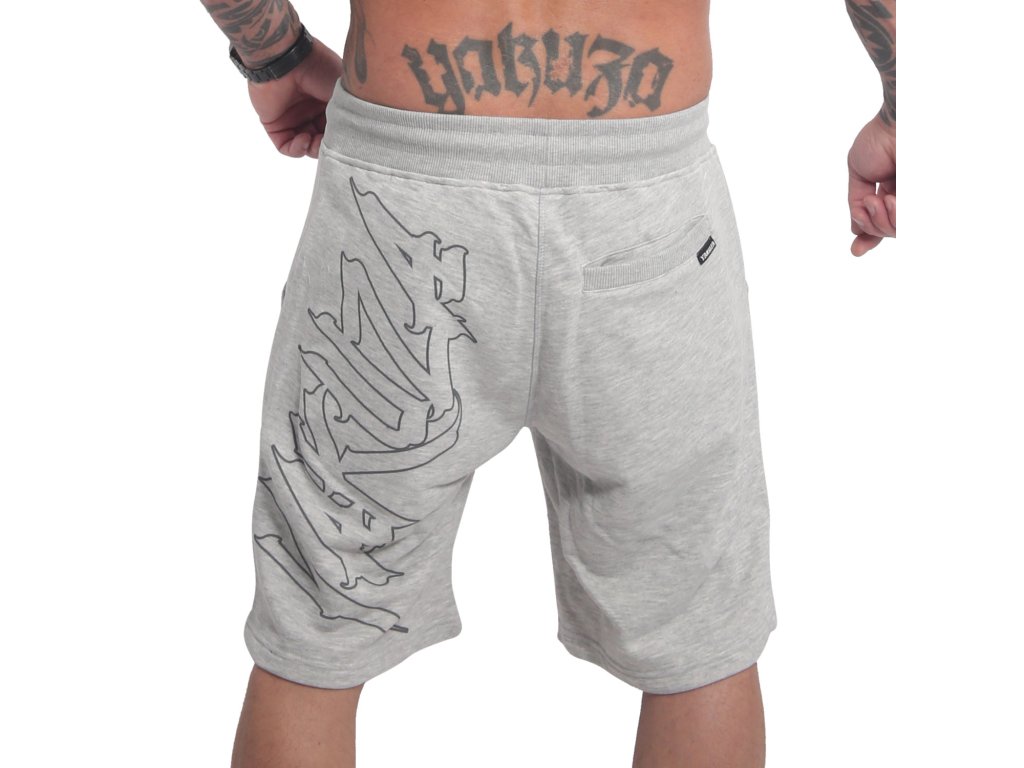 Pánské kraťase Yakuza Jolly Sweat 22056. Šedé kraťase s potiskem na nohavici a samozřejmostí je také štítek s logem Yakuza na bočním švu.
