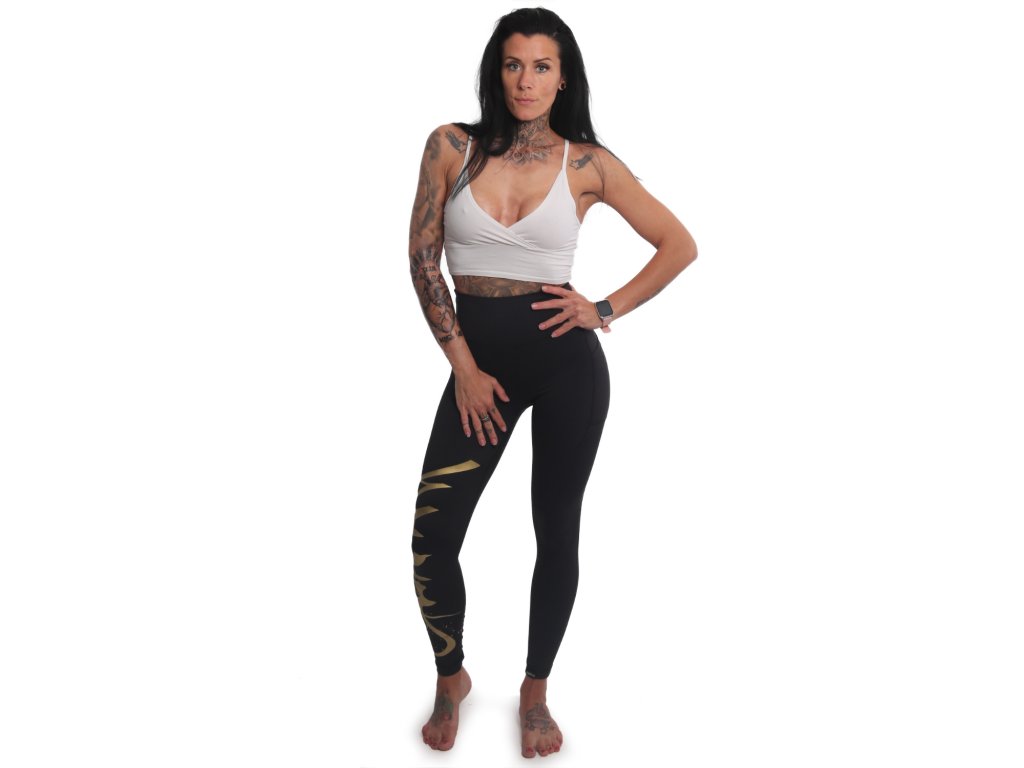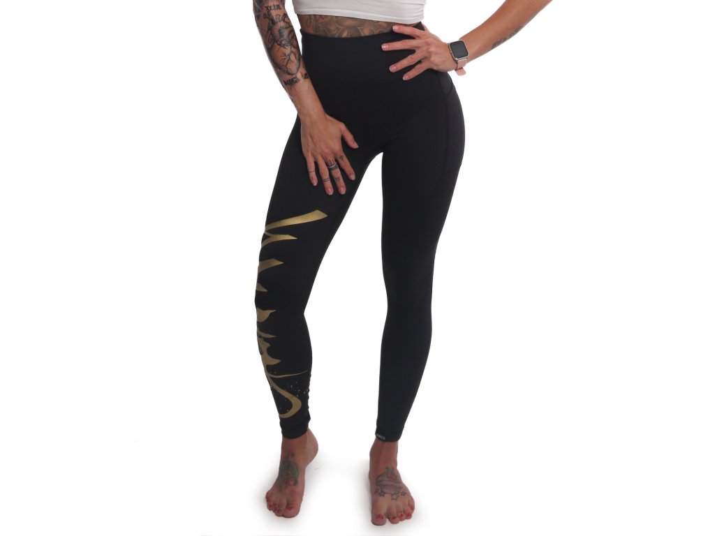 Dámské legíny Yakuza Tag 23146 v délce ke kotníkům. Legíny jsou v černé barvě s potiskem na pravé nohavici z elastického materiálu a vyšším lemem v pase.