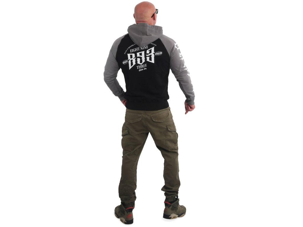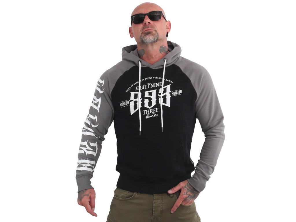 Pánská mikina Yakuza Before Raglan Two Face 21009 s dlouhým rukávem a kapucí. Černo-šedá mikina s potiskem na obou stranách a pravém rukávu, šňůrkou na stahování kapuce a samozřejmostí je štítek s logem Yakuza na bočním švu.
