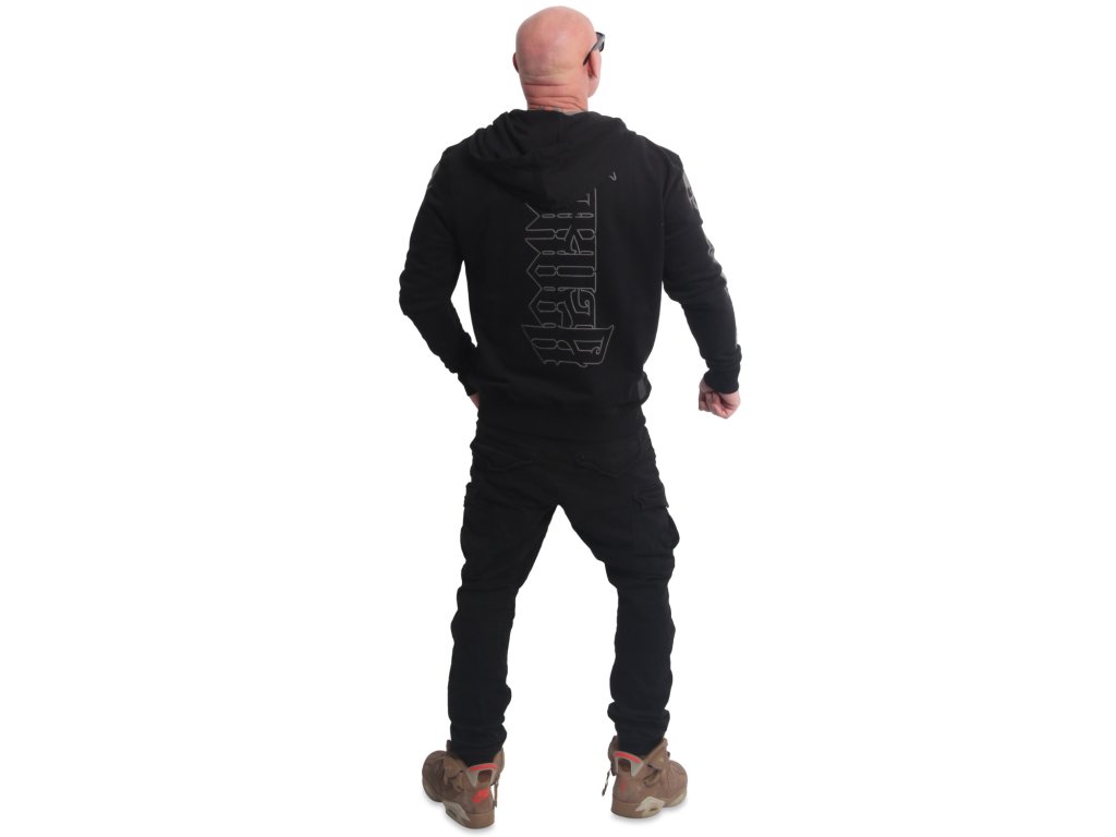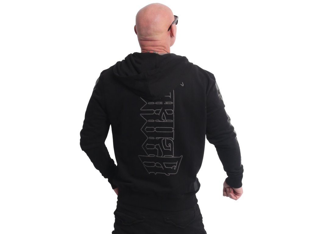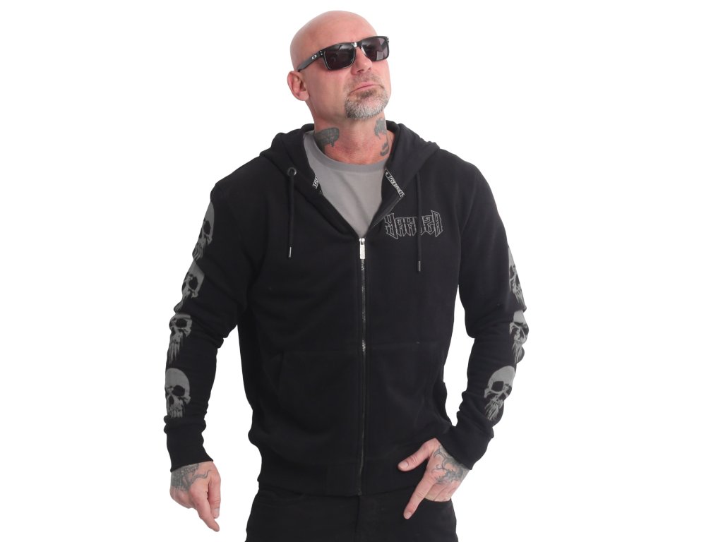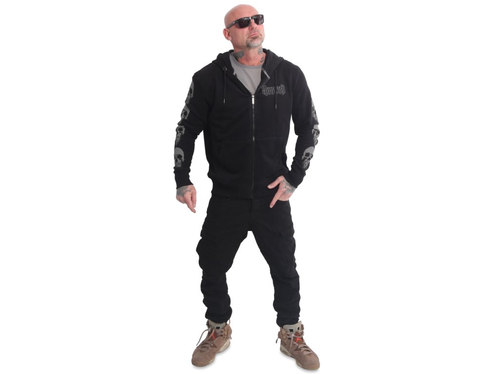 Pánská mikina na zip Yakuza Noggin 22034 s dlouhým rukávem a kapucí. Černá mikina s potiskem na zadní straně arukávech, šňůrkou na stahování kapuce a samozřejmostí je štítek s logem Yakuza na bočním švu.