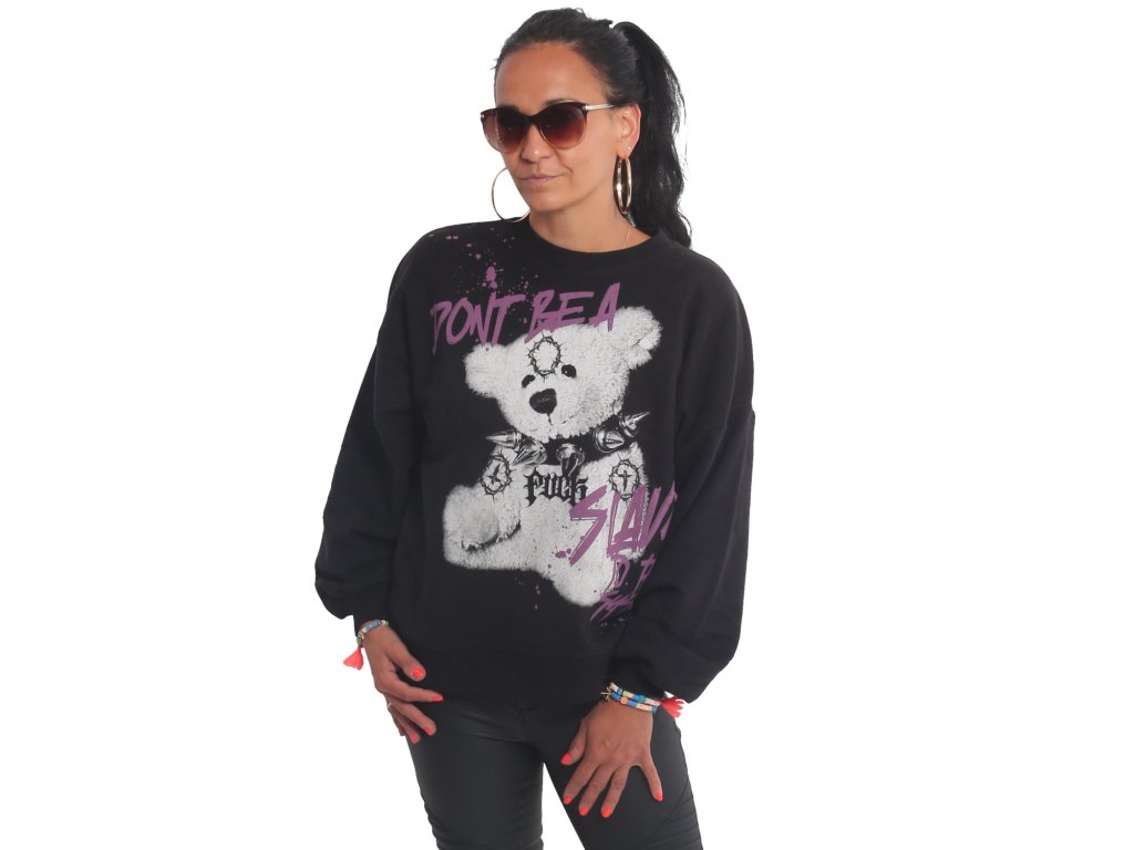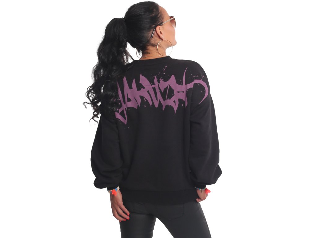 Dámská mikina Yakuza Teddy Urban Pullover 23109. Mikina má černou barvu a bílo-růžový potisk. Střih je volný, pohodlný s žebrovaným lemem a manžetami.
