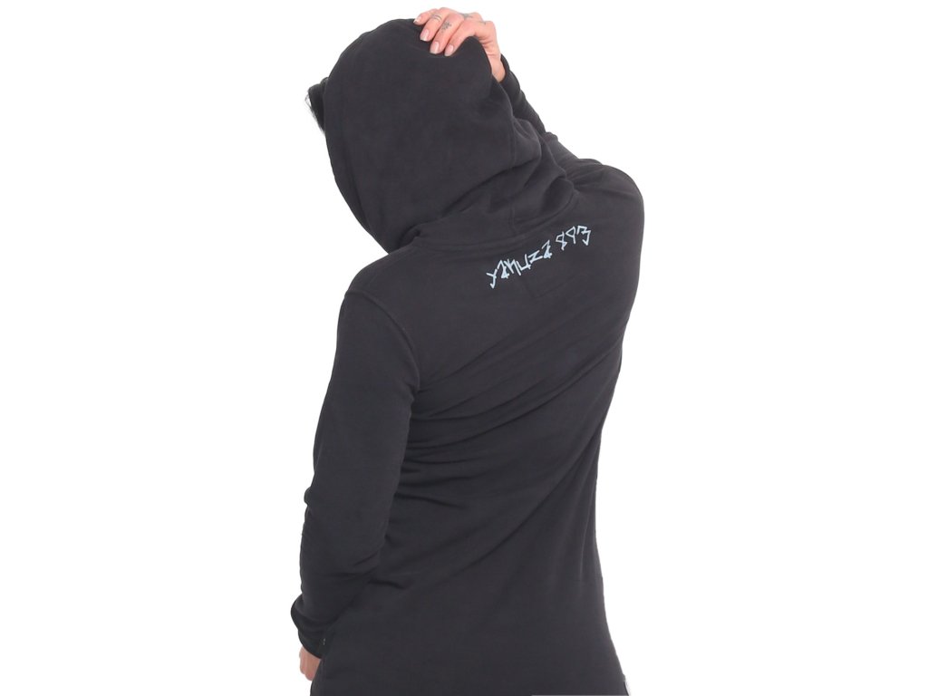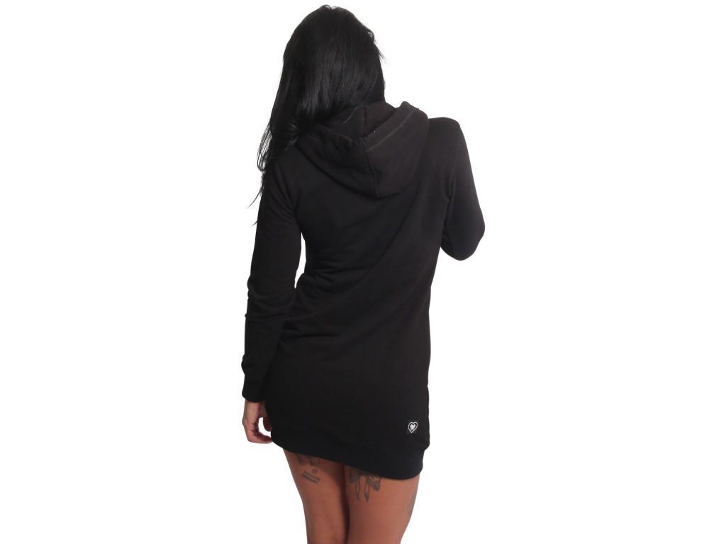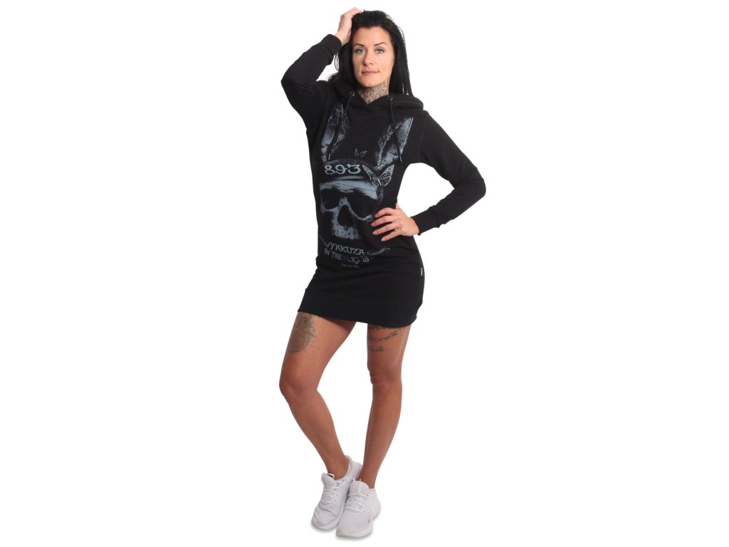 Dámské prodloužené mikina/šaty Yakuza Bunny Kleid 90137. Šaty v černé barvě mají dlouhý rukáv, potisk lebky na přední straně a kapuci na šňůrku.