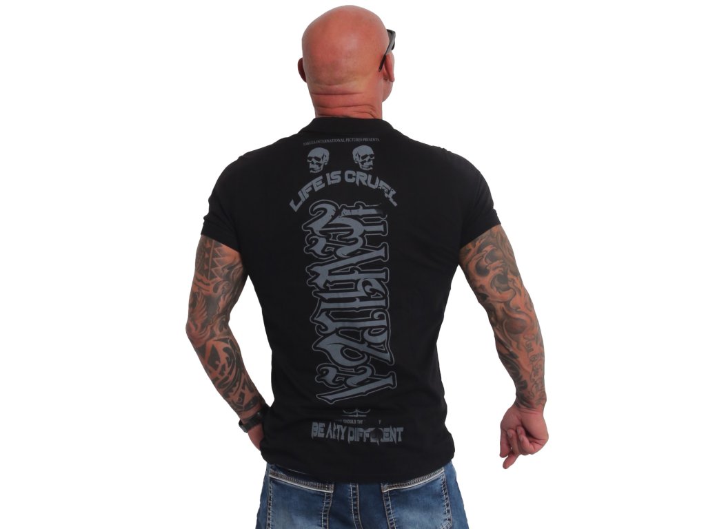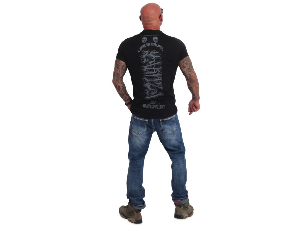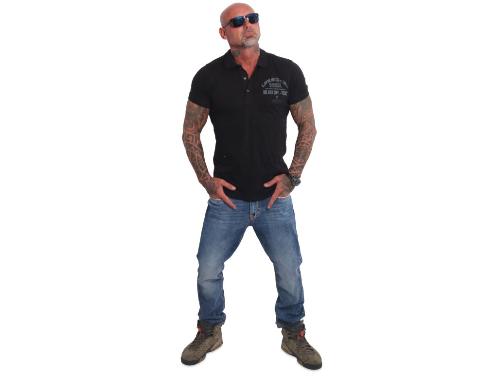 Pánské polo Yakuza Cruel Polo 22021 s krátkým rukávem. Černé triko s potiskem na zadní straně, samozřejmostí je štítek s logem Yakuza na bočním švu.