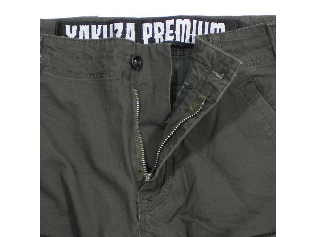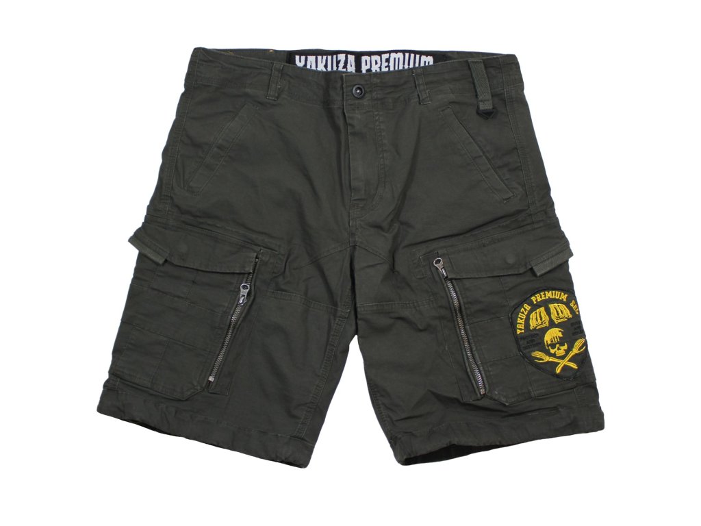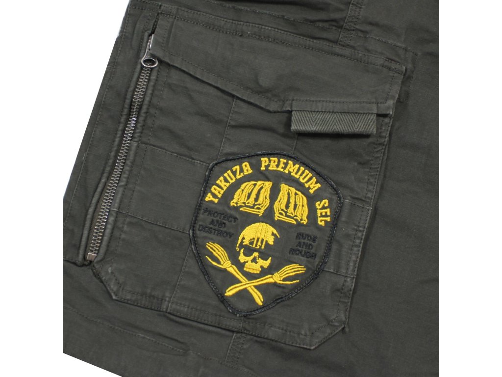 Cargo kraťasy 3450 v tmavě olivové barvě od Yakuza Premium Selection. Kraťasy mají výšivku Yakuza Premium na levé boční kapse.