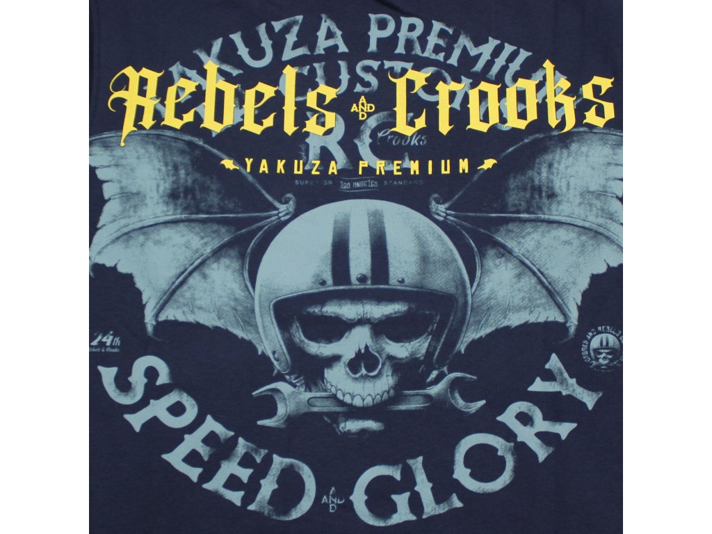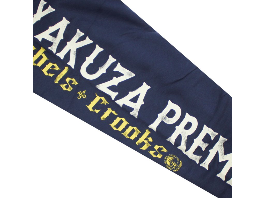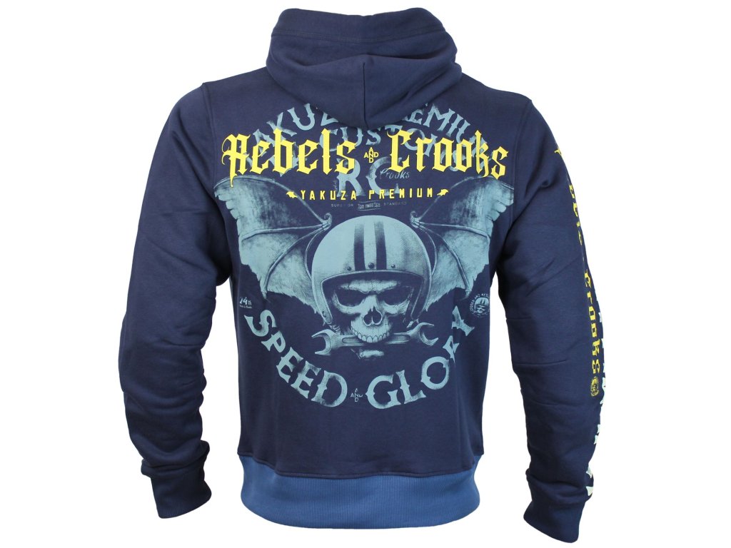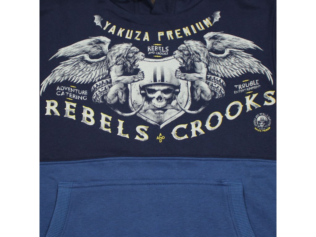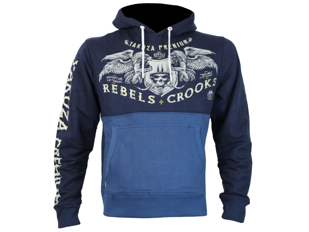 Pohodlná pánská mikina od Yakuza Premium 3623 v modré barvě. Mikina má na přední straně erb s lebkou a na zadní straně potisk přes celé záda, kapuci se stahovací šňůrkou a také klokanní kapsu.