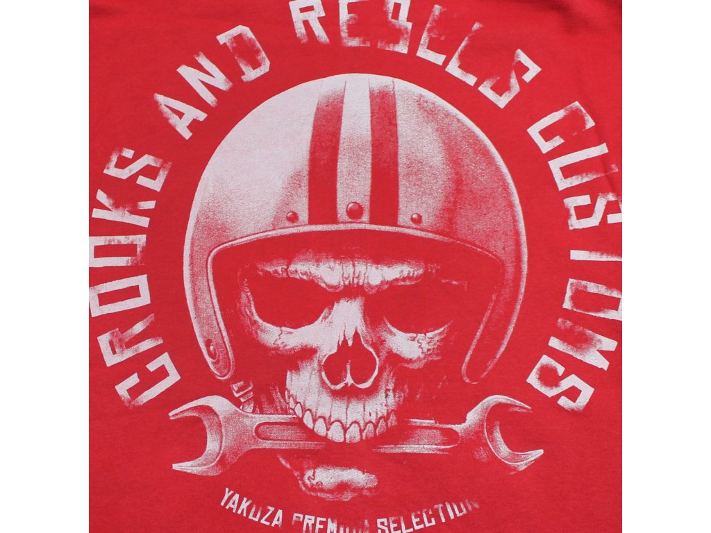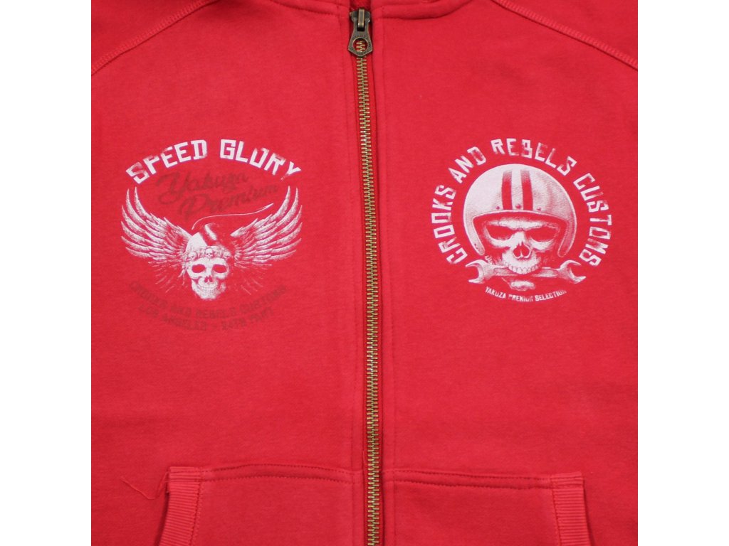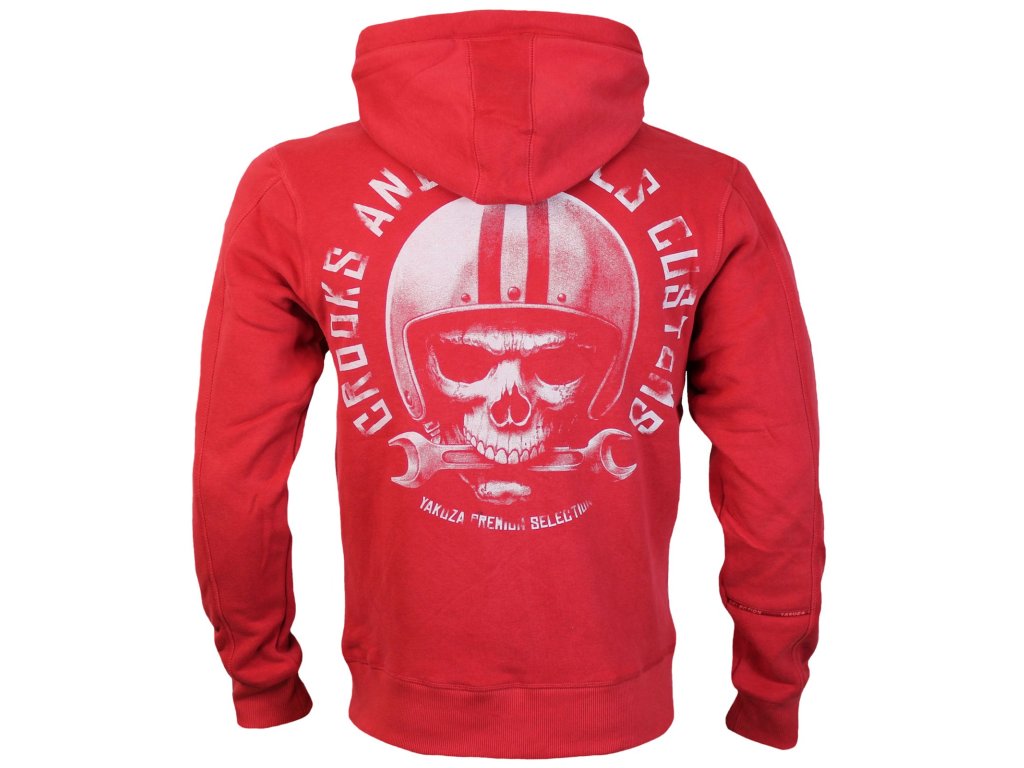 Červená mikina Yakuza Premium s kapucí a velkým potiskem lebky v helmě na zadní straně.