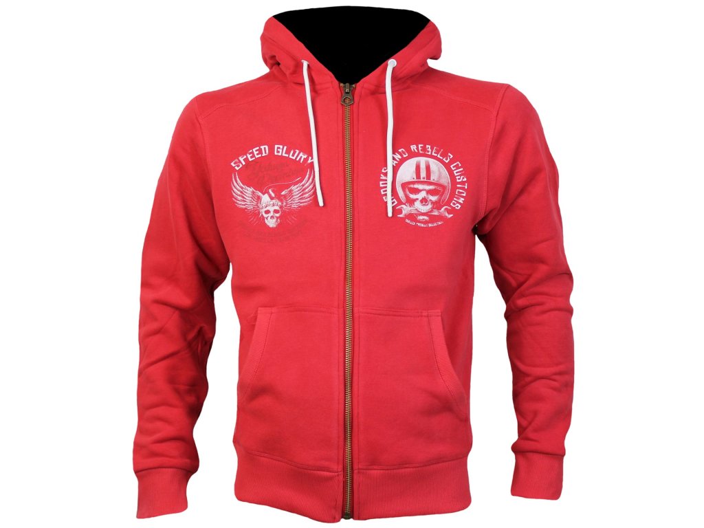 Pánská mikina 3624 v červené barvě od Yakuza Premium Selection. Na zadní straně má velký kulatý potisk lebky v helmě. Mikina má zip, vpředu dvě boční kapsy a na kapuci stahovací šňůrku.. Rozměry v příkladu velikosti XL jsou cca 50 / 55 / 68 a 60 cm měřeno vleže pas / hrudník / záda a paže. Vzhledem k tomu, že tato mikina má velmi padnoucí střih, v případě pochyb objednejte o číslo větší.