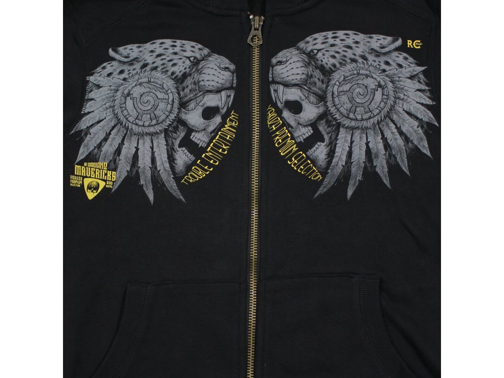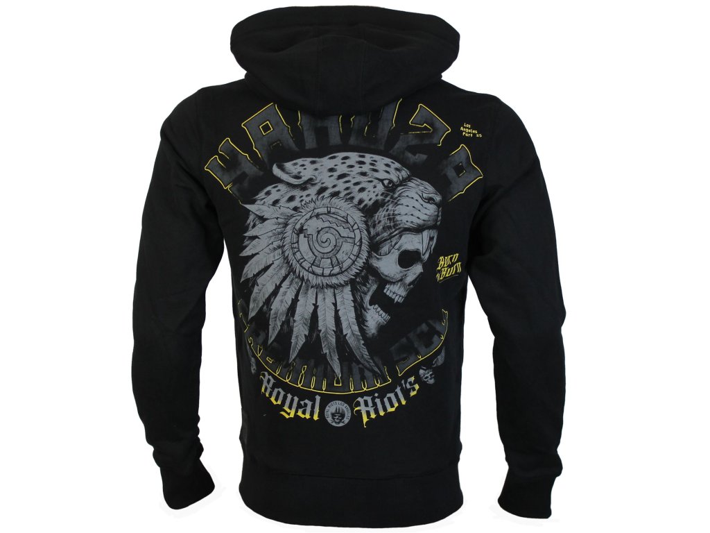 Pánská mikina 3725B v černé barvě od Yakuza Premium Selection z kolekce podzim/zima 2024. Na zadní straně má velký potisk indiána. Mikina má zip, vpředu dvě boční kapsy a na kapuci stahovací šňůrku. Rozměry v příkladu velikosti XL jsou cca 50 / 55 / 68 a 60 cm měřeno vleže pas / hrudník / záda a paže. Vzhledem k tomu, že tato mikina má velmi padnoucí střih, v případě pochyb objednejte o číslo větší.