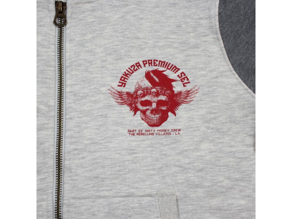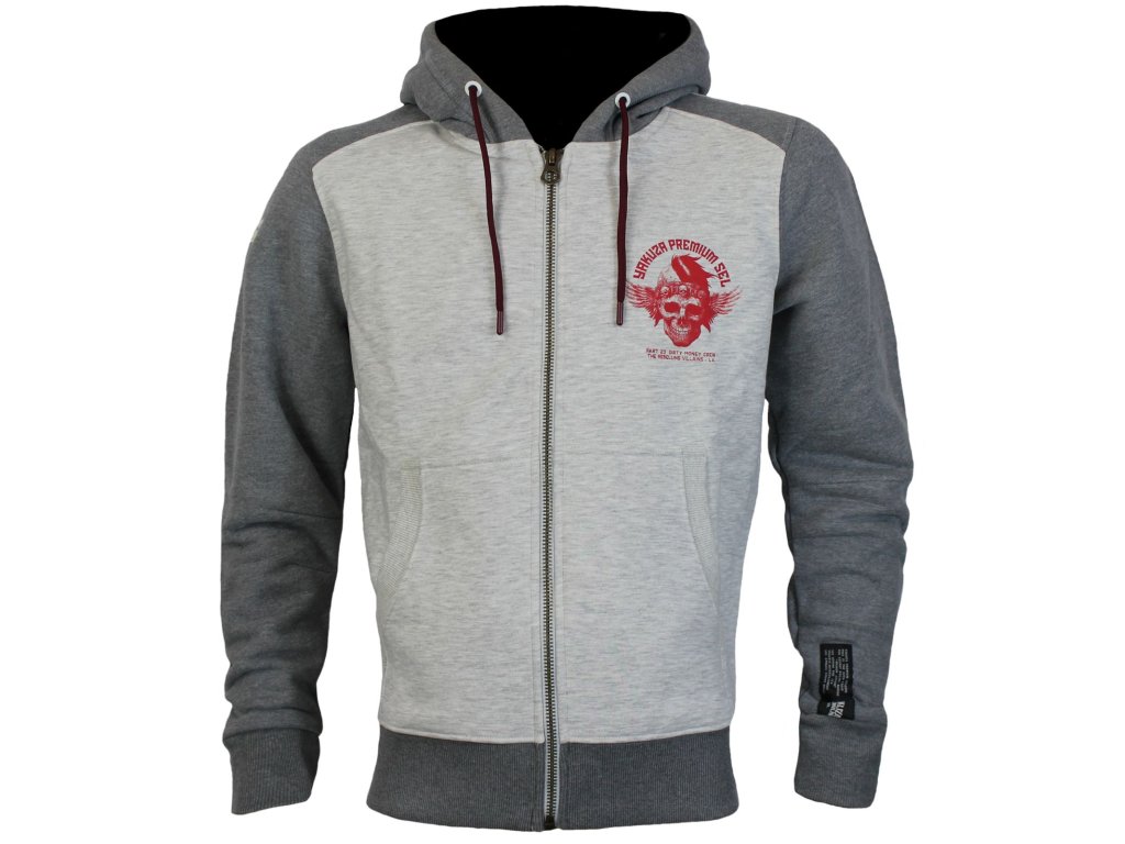 Pánská mikina 3527 v šedé barvě od Yakuza Premium Selection z kolekce podzim/zima 2023. Na zadní straně má velký potisk dvou indiánských lebek. Mikina má zip, kapuci na stahovací šňůrku a dvě postraní kapsy. Rozměry v příkladu velikosti XL jsou cca 50 / 55 / 68 a 60 cm měřeno vleže pas / hrudník / záda a paže. Vzhledem k tomu, že tato mikina má velmi padnoucí střih, v případě pochyb objednejte o číslo větší.