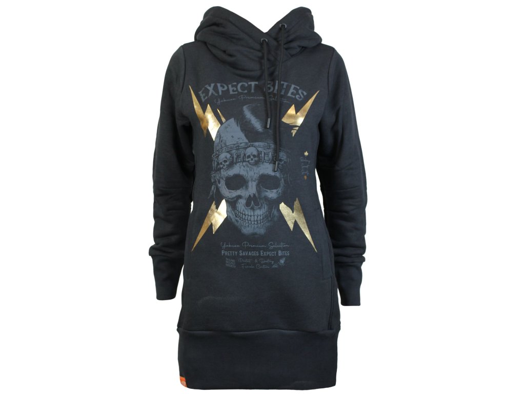 Mikina/šaty v černé od Yakuza Premium mají na přední straně velký potisk lebky, kapuci se stahovací šňůrkou a dvě boční kapsy. Šaty jsou velmi přiléhavého extra dlouhého střihu, v případě pochyb objednejte o číslo větší.