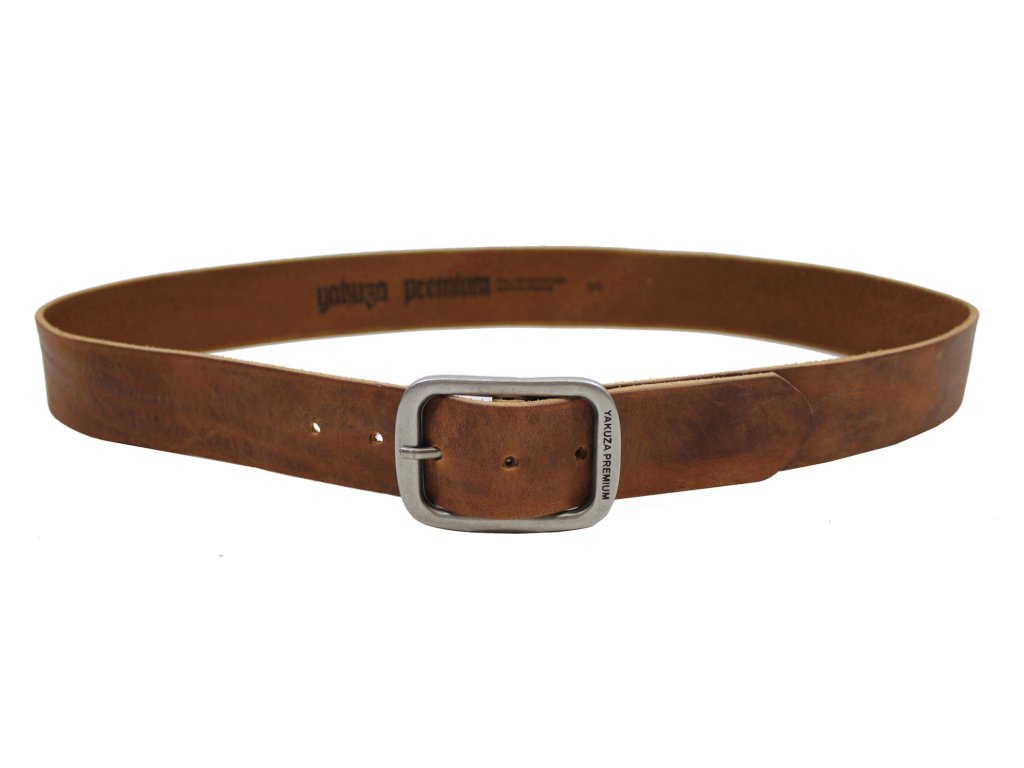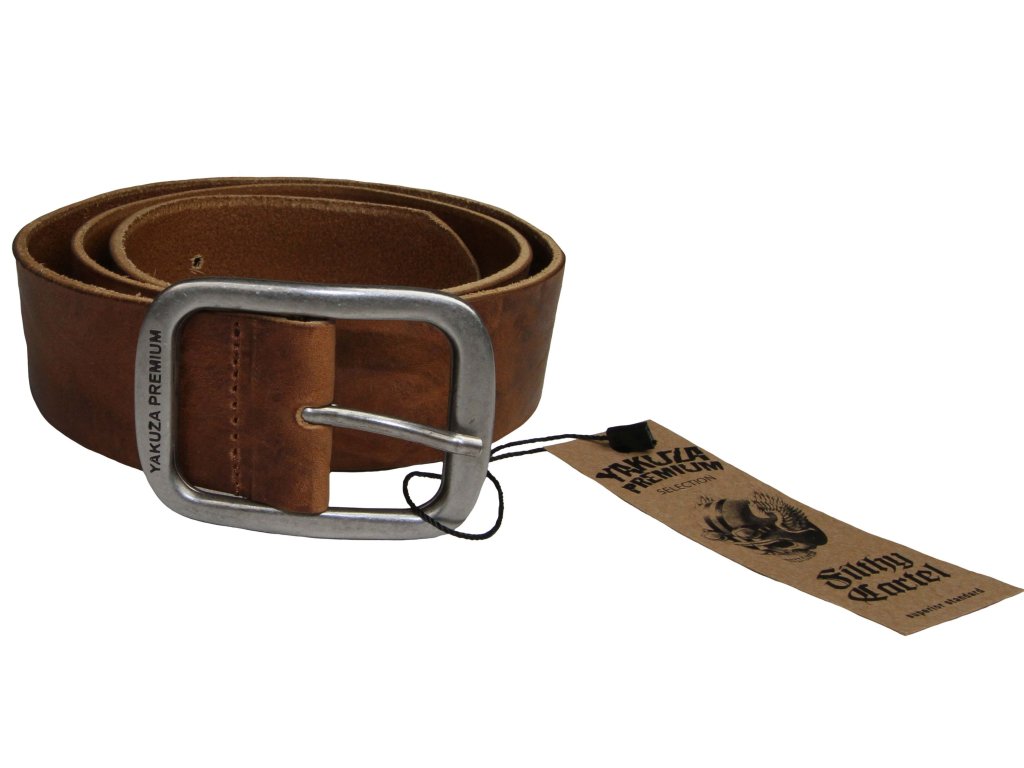 Pásek 2592 v hnědé barvě od Yakuza Premium Selection. Kožený pásek s velkou kovovou přezkou má 4 možnosti nastavení délky.