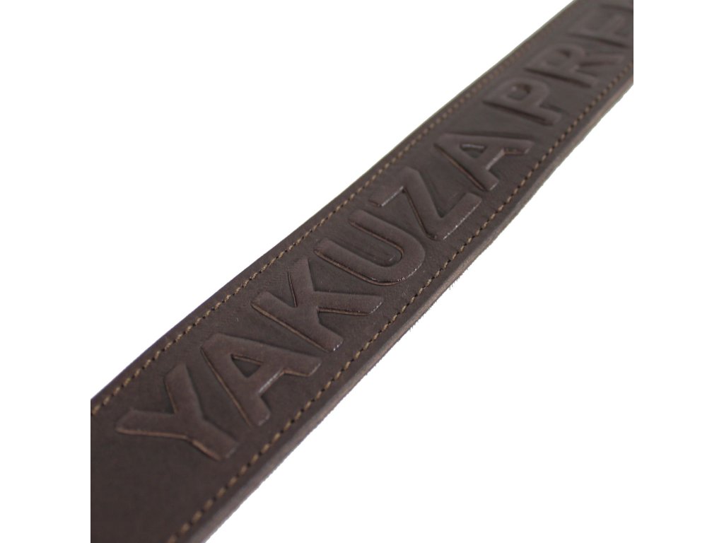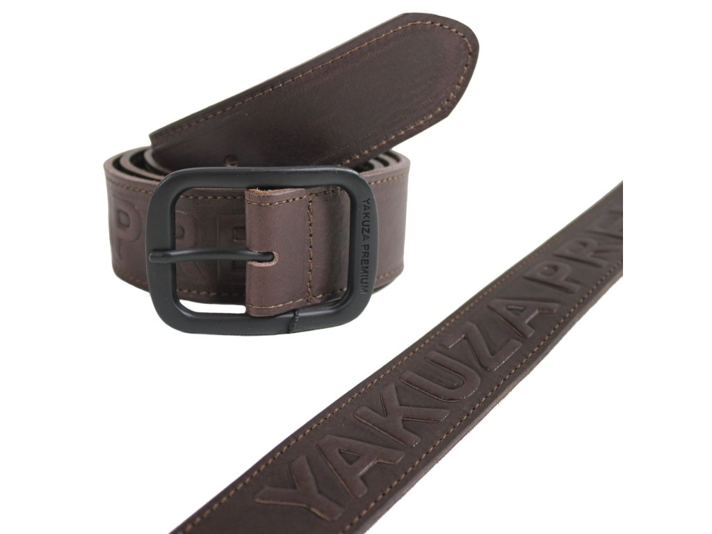 Pásek Yakuza Premium z pravé kůže s masivní kovovou sponou a nápisem YAKUZA PREMIUM po obvodu.