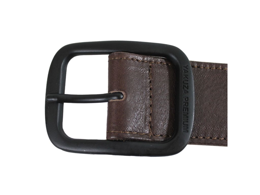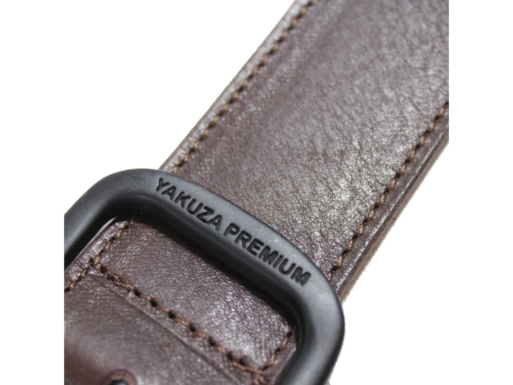 Pásek 2970 v tmavě hnědé barvě od Yakuza Premium Selection. Kožený pásek s velkou kovovou přezkou má 4 možnosti nastavení délky.