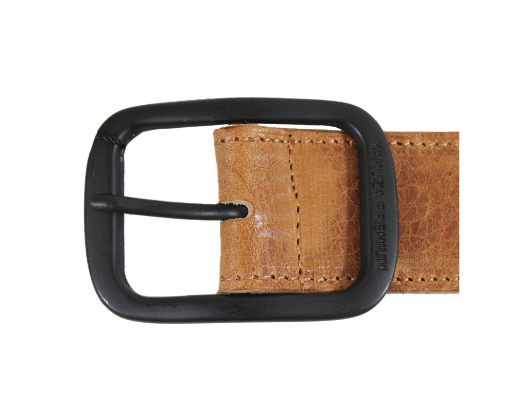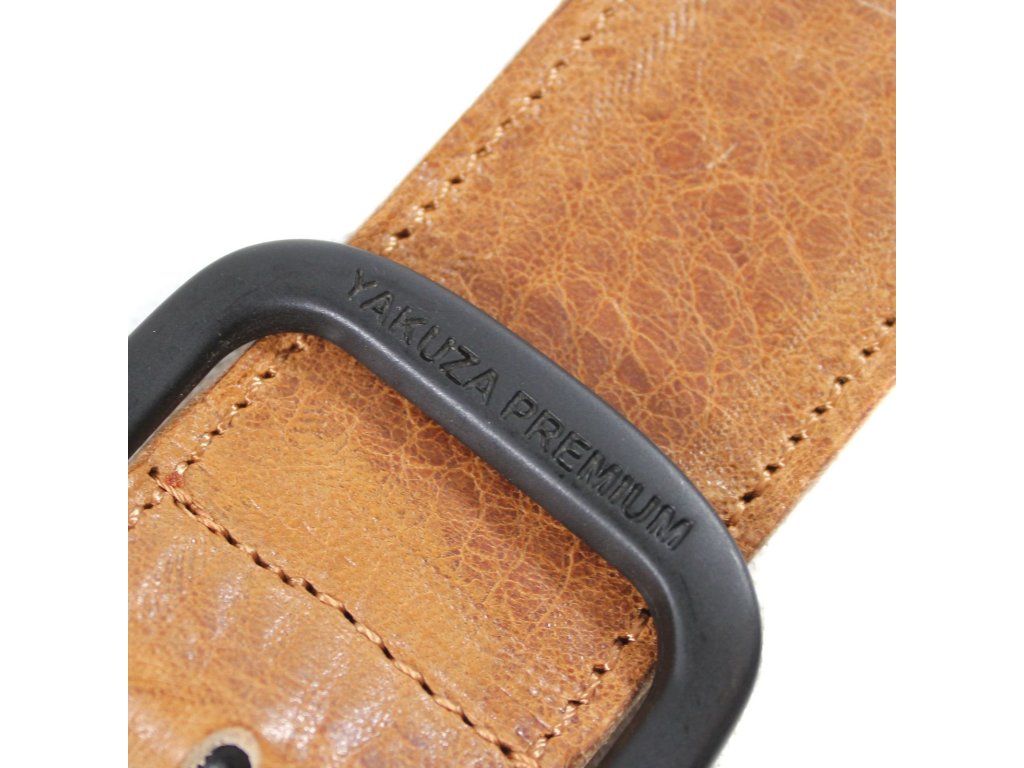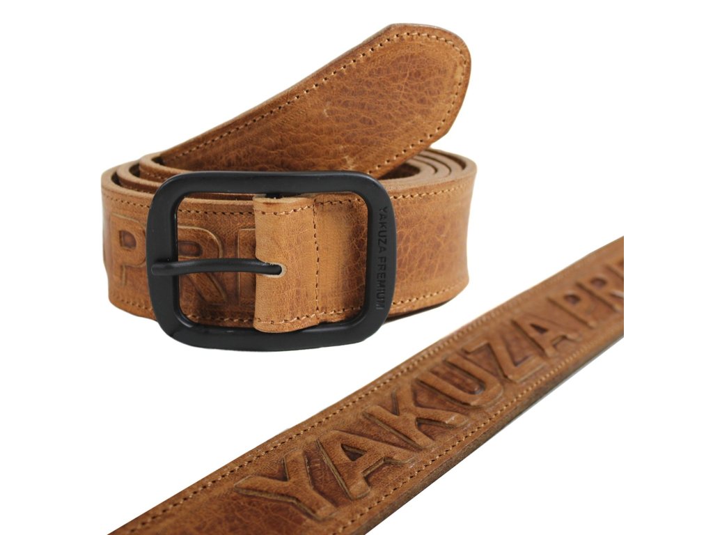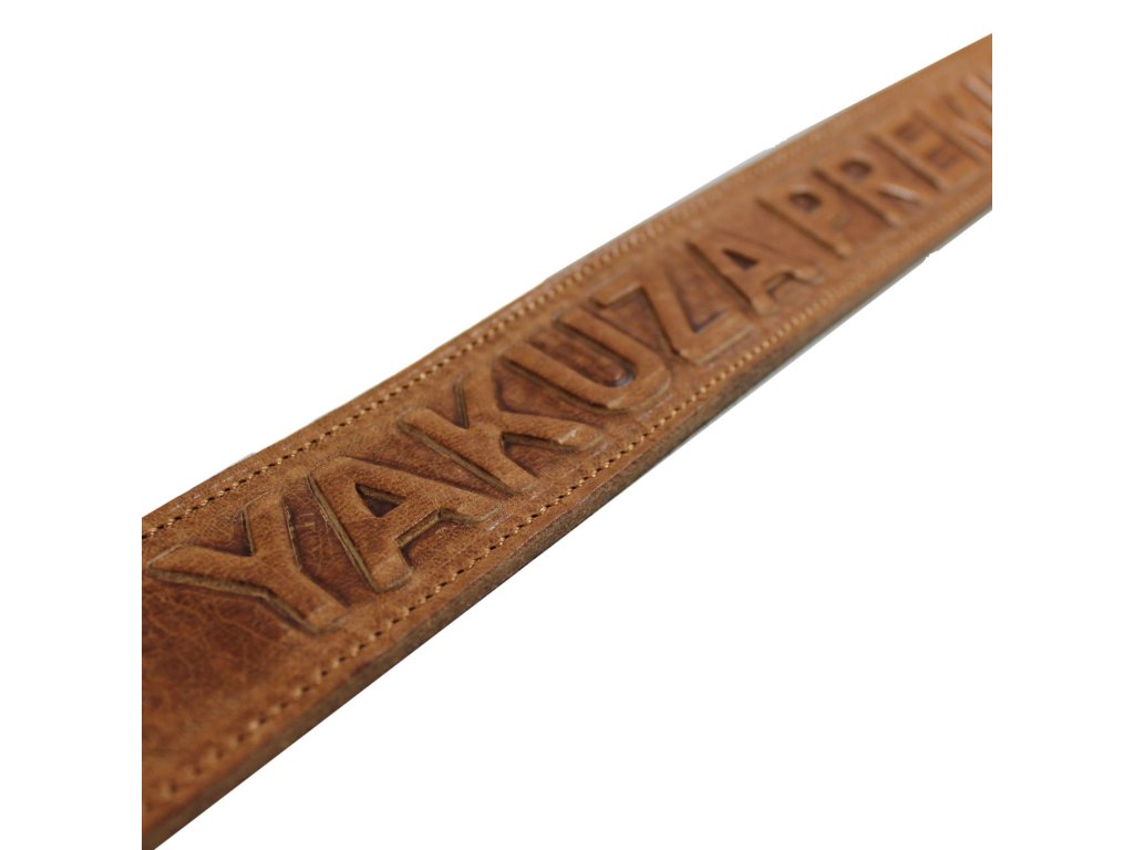 Pásek Yakuza Premium z pravé kůže s masivní kovovou sponou a nápisem YAKUZA PREMIUM po obvodu.