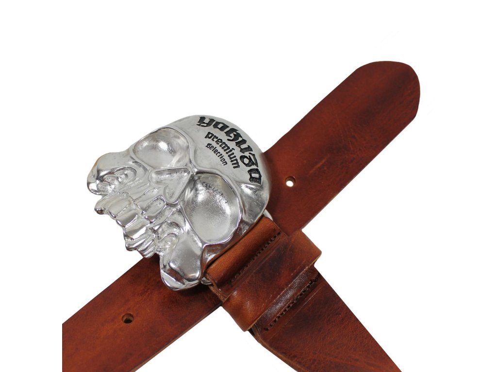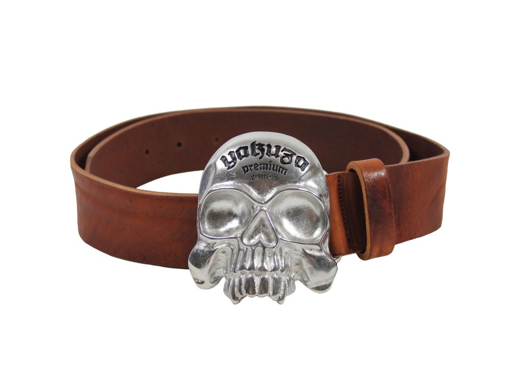 Pásek 3071 v hnědé barvě od Yakuza Premium Selection. Kožený pásek s velkou kovovou přezkou ve tvaru lebky. 4 možnosti nastavení délky.