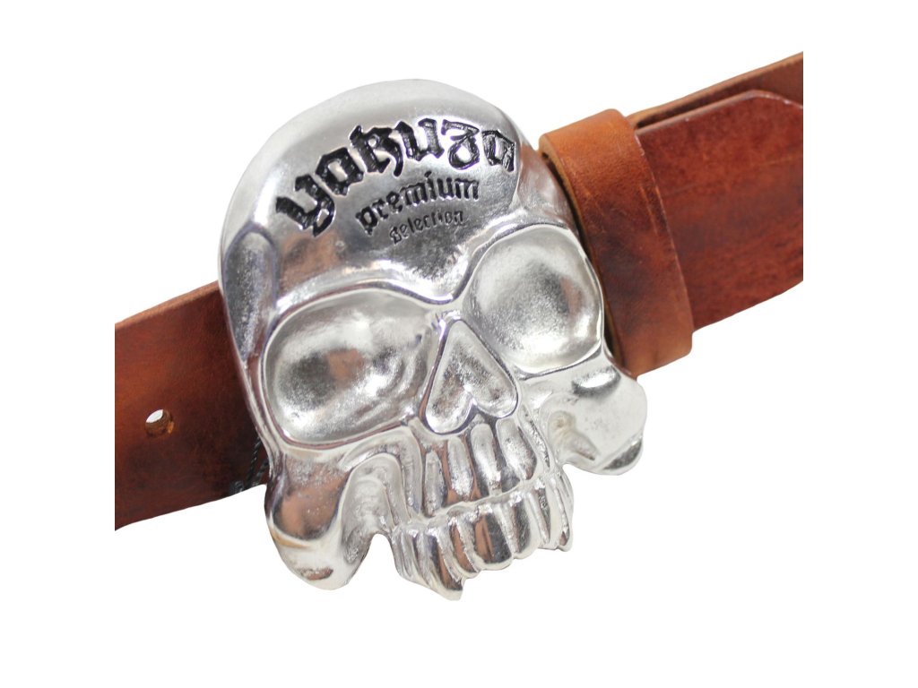 Pásek Yakuza Premium z pravé kůže s velkou přezkou ve tvaru lebky.
