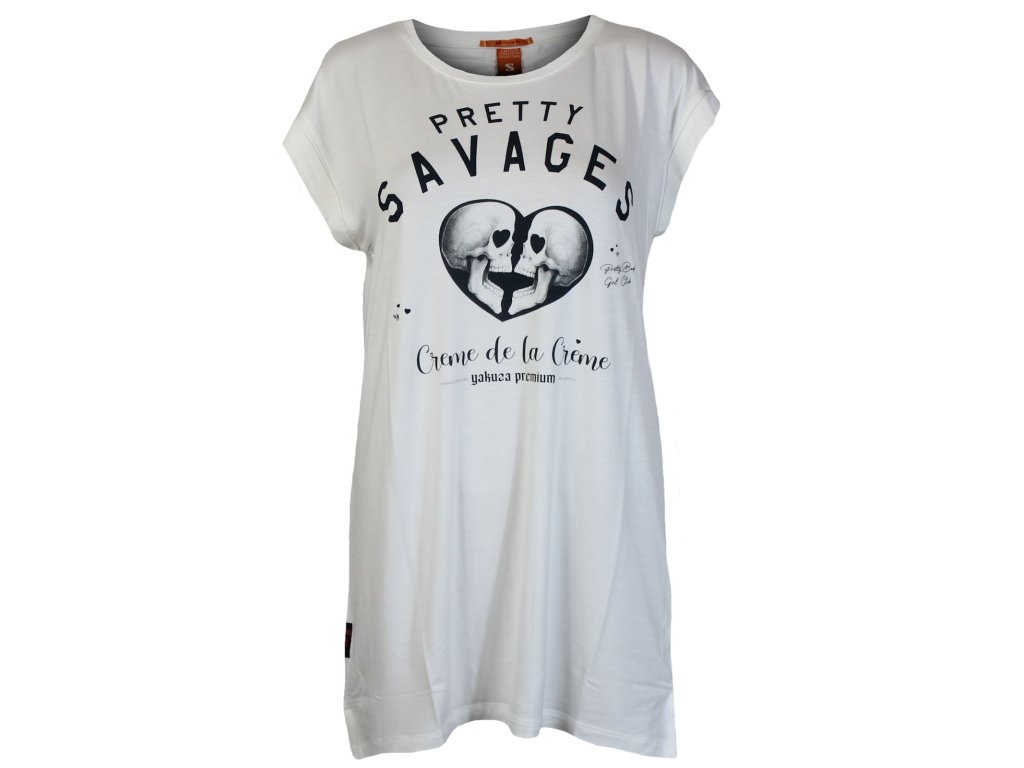 Dámské mini šaty Yakuza Premium Selection 3731 v bílé barvě z kolekce podzim/zima 2024. Tyto šaty má na přední straně potisk srdce s lebkou a střih pod zadek. Měkká bavlněná směs pro skvělé pohodlí.