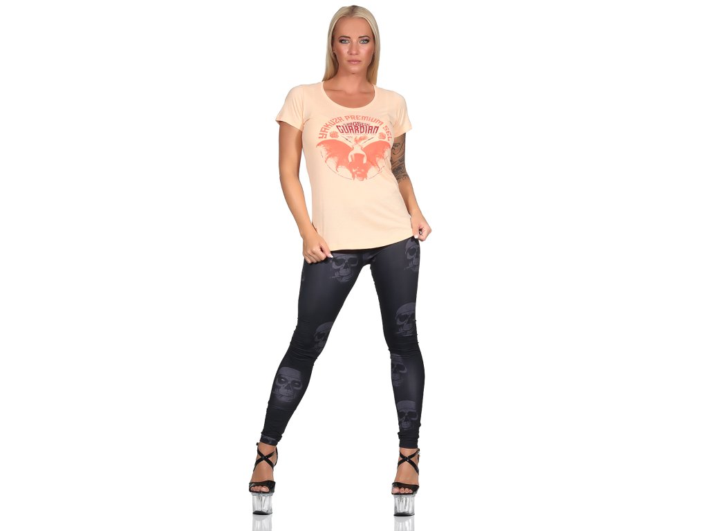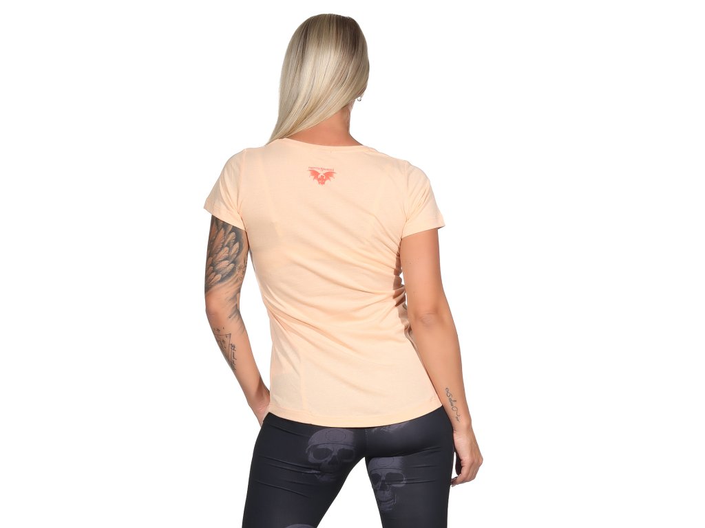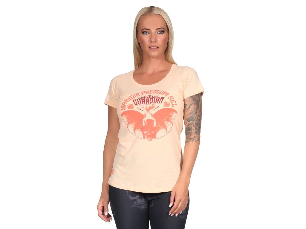 Dámské tričko Yakuza Premium 3532 ve světle oranžové barvě. Triko má na přední straně velký potisk a na zadní straně je velmi malý potisk netopýra v oblasti krku. Má široký kulatý výstřih a volnějších střih. Zadní část trika je prodloužená. V případě pochyb objednejte o číslo větší.