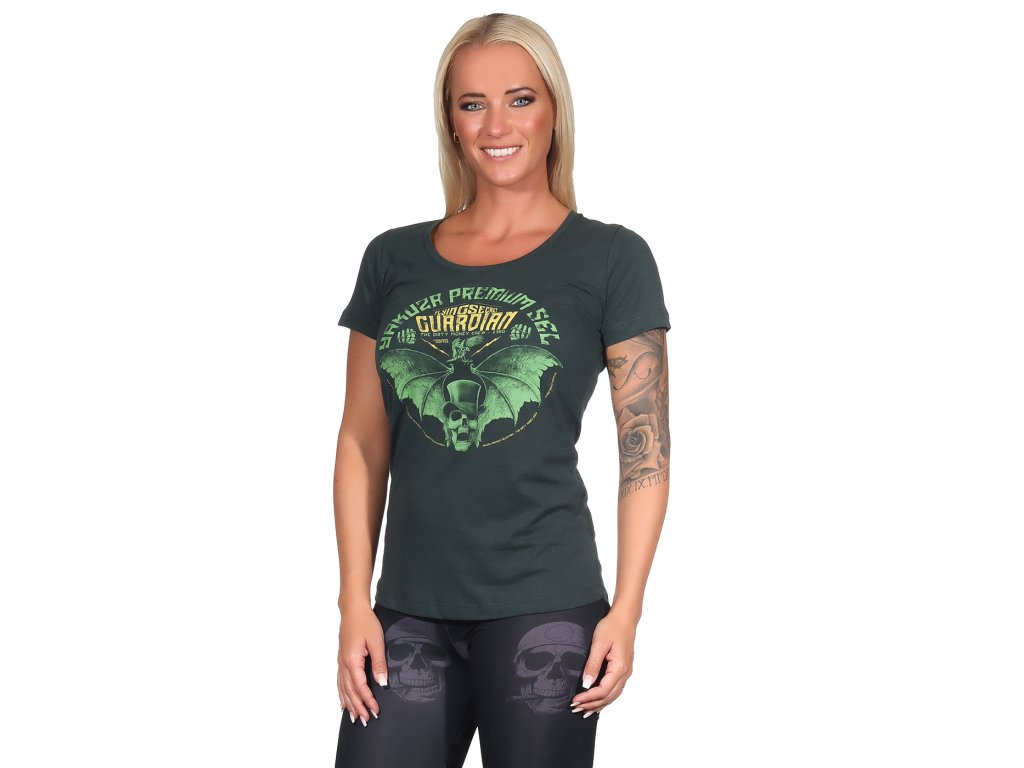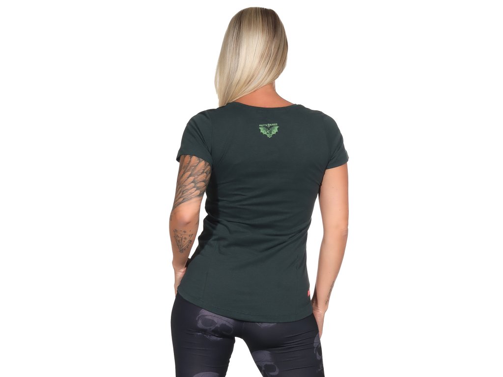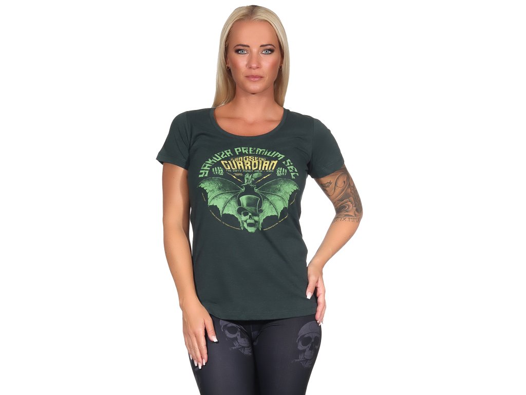 Dámské tričko Yakuza Premium 3532 ve tmavě zelené barvě. Triko má na přední straně velký potisk a na zadní straně je velmi malý potisk netopýra v oblasti krku. Má široký kulatý výstřih a volnějších střih. Zadní část trika je prodloužená. V případě pochyb objednejte o číslo větší.