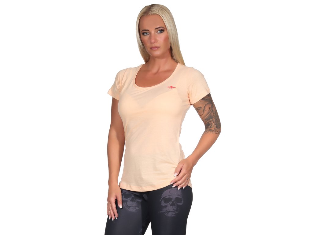 Dámské tričko Yakuza Premium 3534 v oranžové barvě. Triko má na zadní straně velký potisk lebky v cylindru. Má široký kulatý výstřih a volnějších střih. V případě pochyb objednejte o číslo větší.