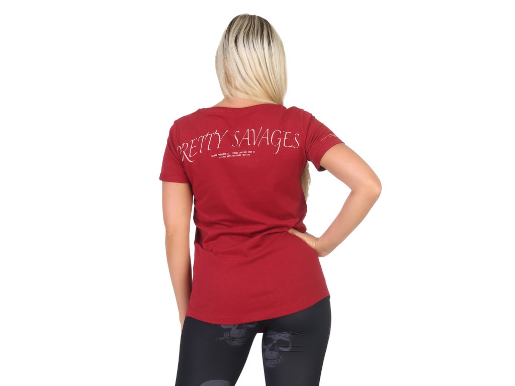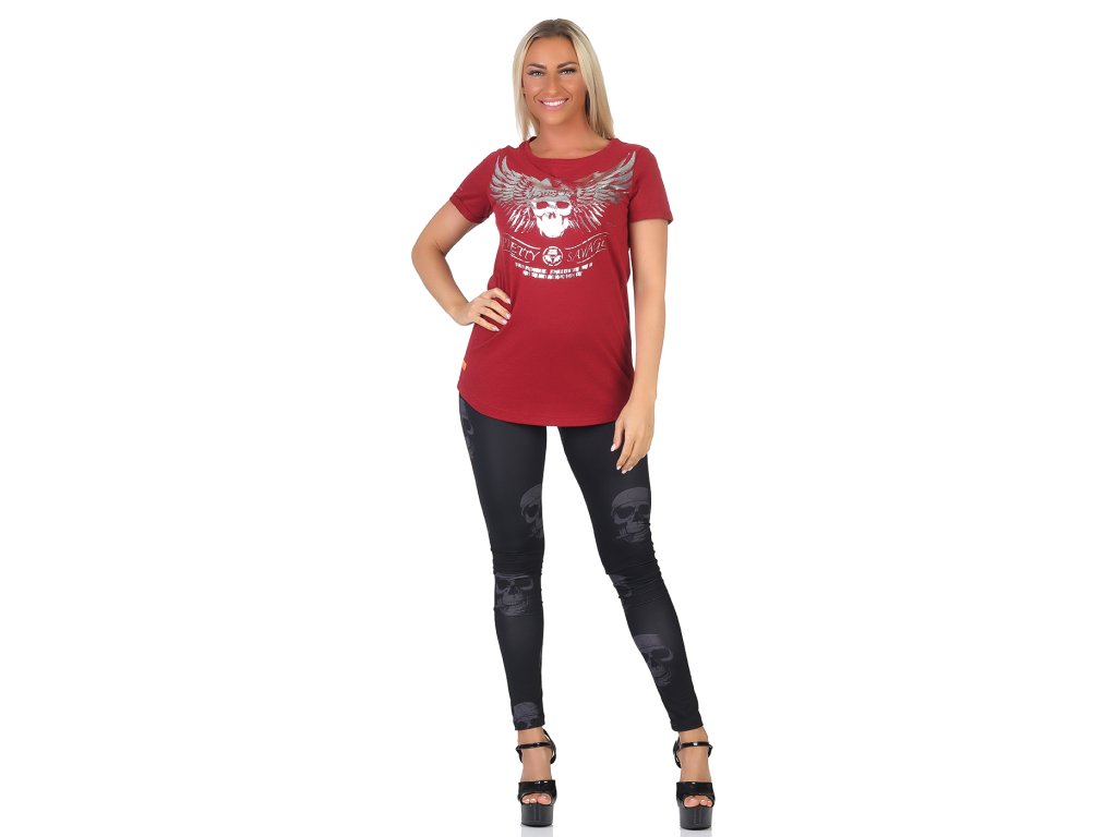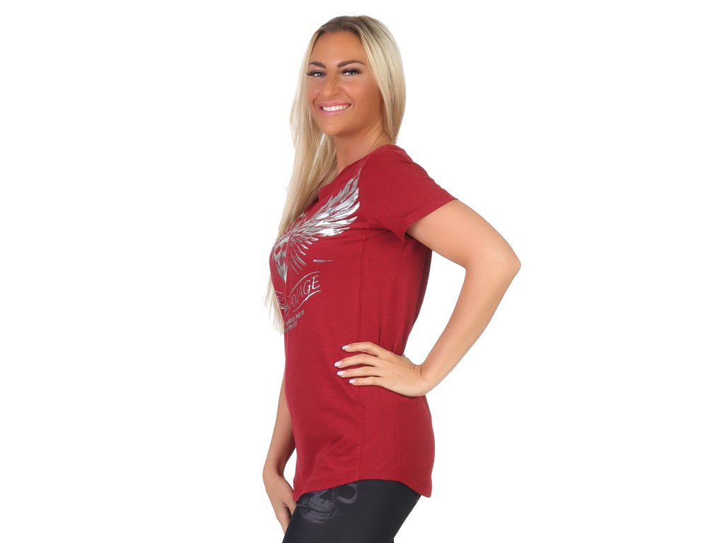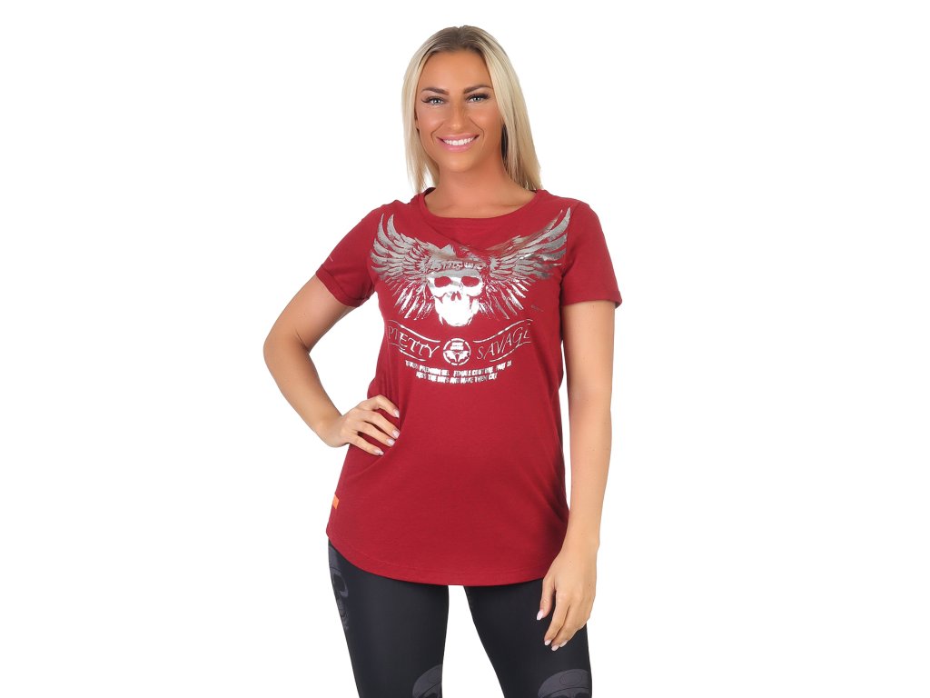 Dámské tričko Yakuza Premium Selection 3537 v červené barvě z kolekce podzim/zima 2023. Toto tričko má na přední straně stříbrný potisk lebky s křídly. Měkká bavlněná směs pro skvělé pohodlí.