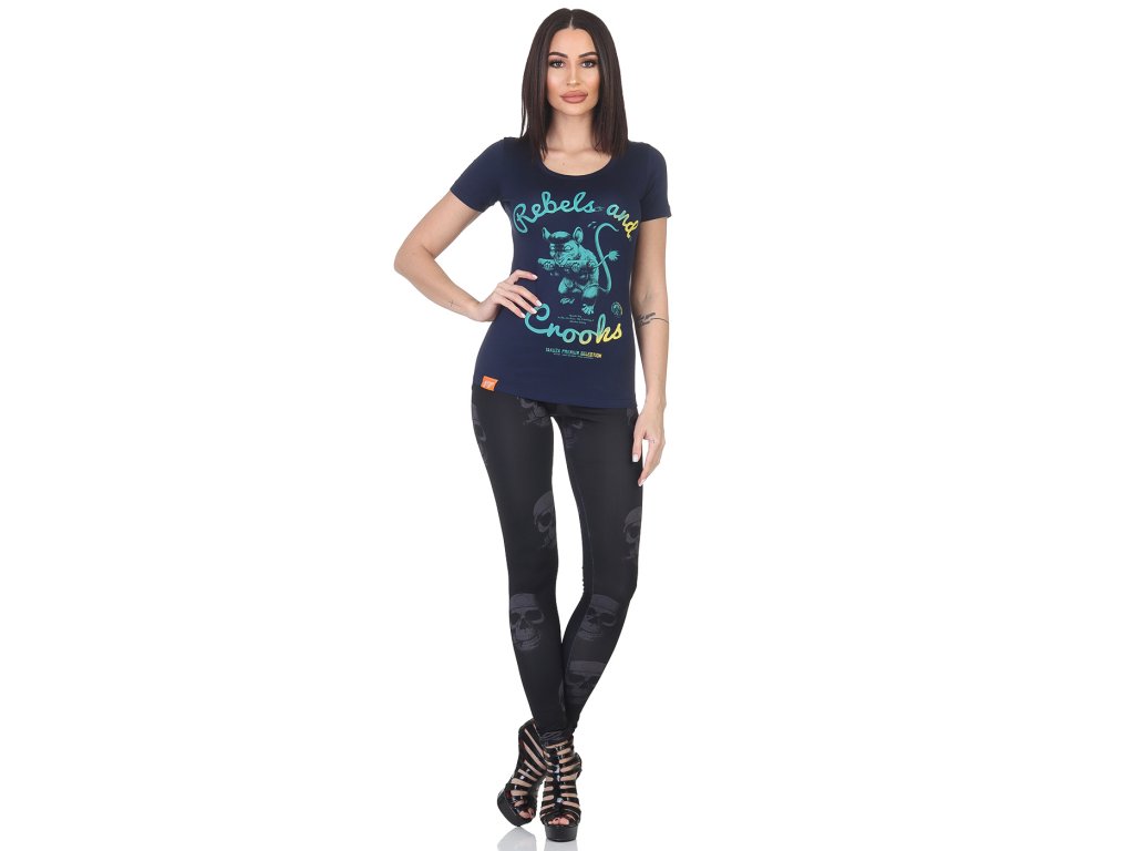 Dámské tričko Yakuza Premium Selection 3634 v tmavě modré barvě z kolekce jaro/léto 2024. Toto tričko má na přední straně potisk krysy s dynamitem a prodloužený střih. Měkká bavlněná směs pro skvělé pohodlí.