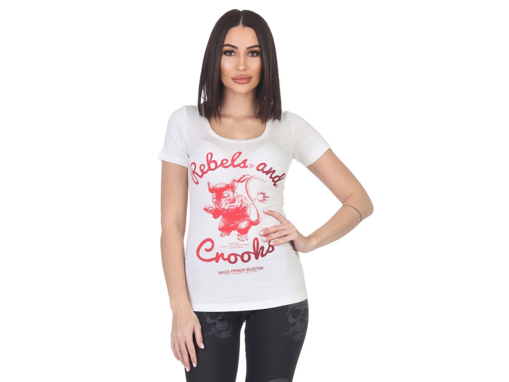 Dámské tričko Yakuza Premium Selection 3634 v bílé barvě z kolekce jaro/léto 2024. Toto tričko má na přední straně potisk krysy s dynamitem a prodloužený střih. Měkká bavlněná směs pro skvělé pohodlí.