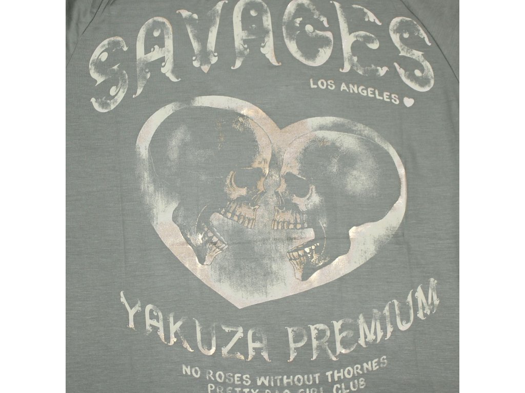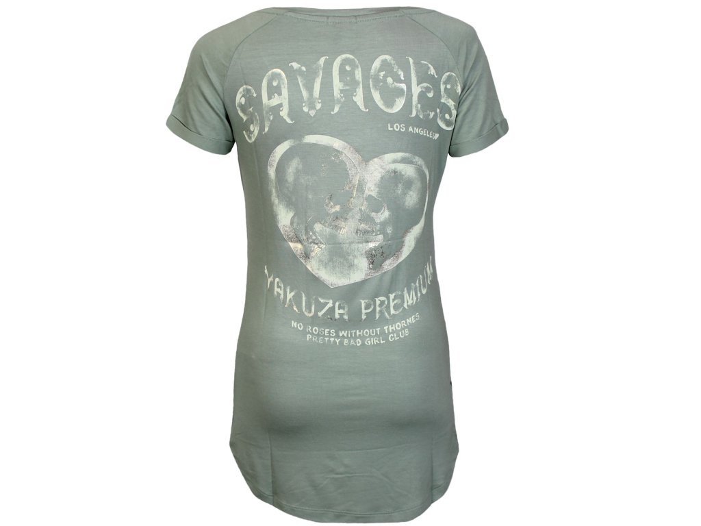 Dámské tričko Yakuza Premium Selection 3734 v olivové barvě z kolekce podzim/zima 2024. Toto tričko má na zadní straně potisk lebky a výstřih do V. Měkká bavlněná směs pro skvělé pohodlí.