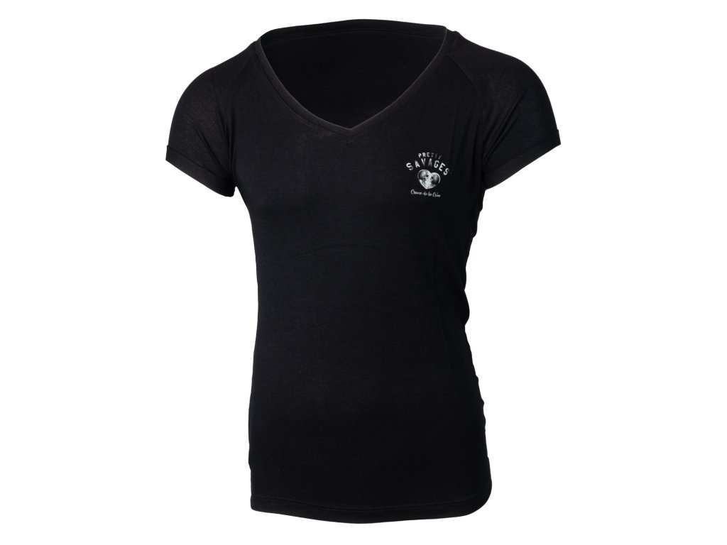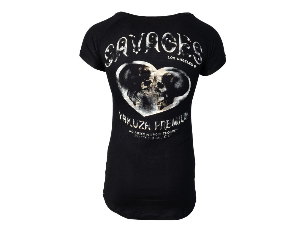 Dámské tričko Yakuza Premium Selection 3734 v černé barvě z kolekce podzim/zima 2024. Toto tričko má na zadní straně potisk lebky a výstřih do V. Měkká bavlněná směs pro skvělé pohodlí.
