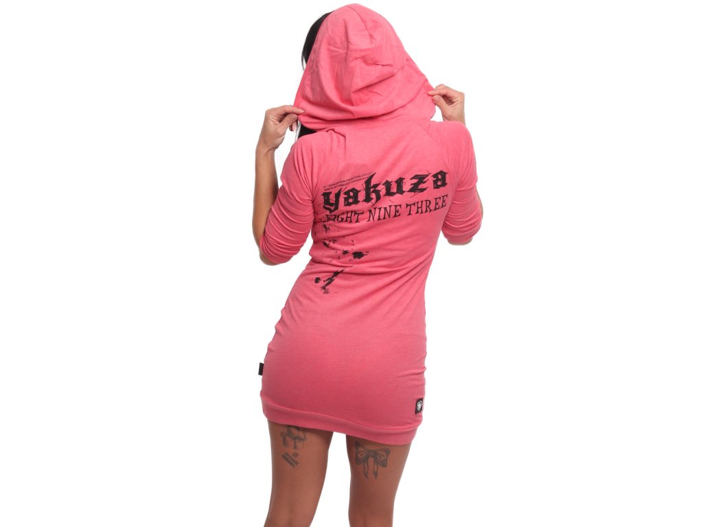 Dámské šaty Yakuza Brute Force Hooded 90115 . Šaty v růžové barvě mají 3/4 rukáv, černý potisk na přední i zadní straně, kulatý výstřih a kapuci.