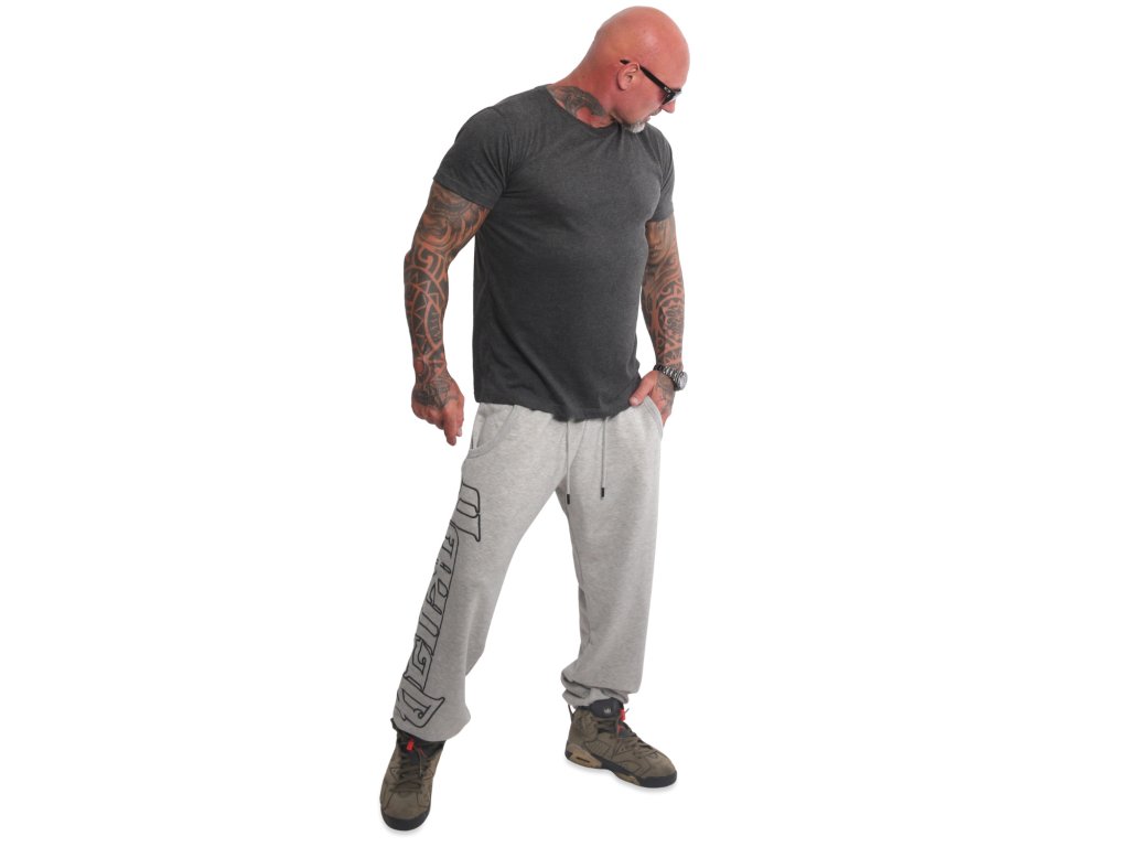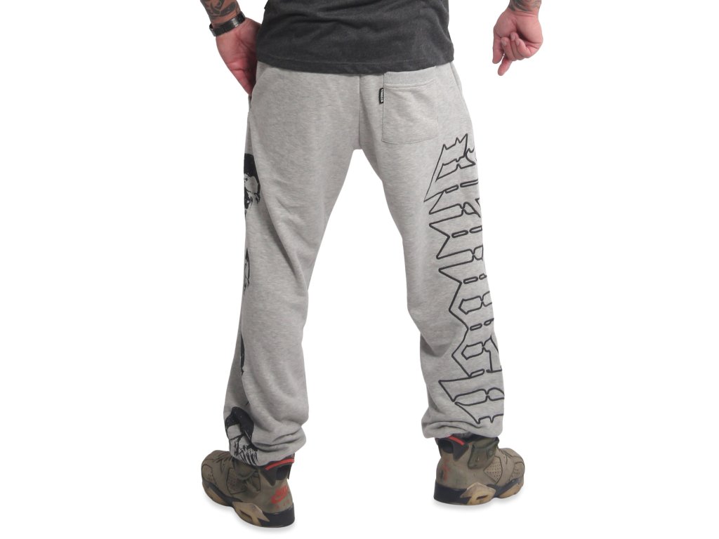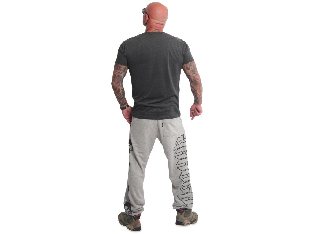 Pánské tepláky Yakuza Noggin Loose Joggers 22058. Šedé tepláky s potiskem na obou nohavicích, s kapsami a zúženým kotníkovým lemem.
