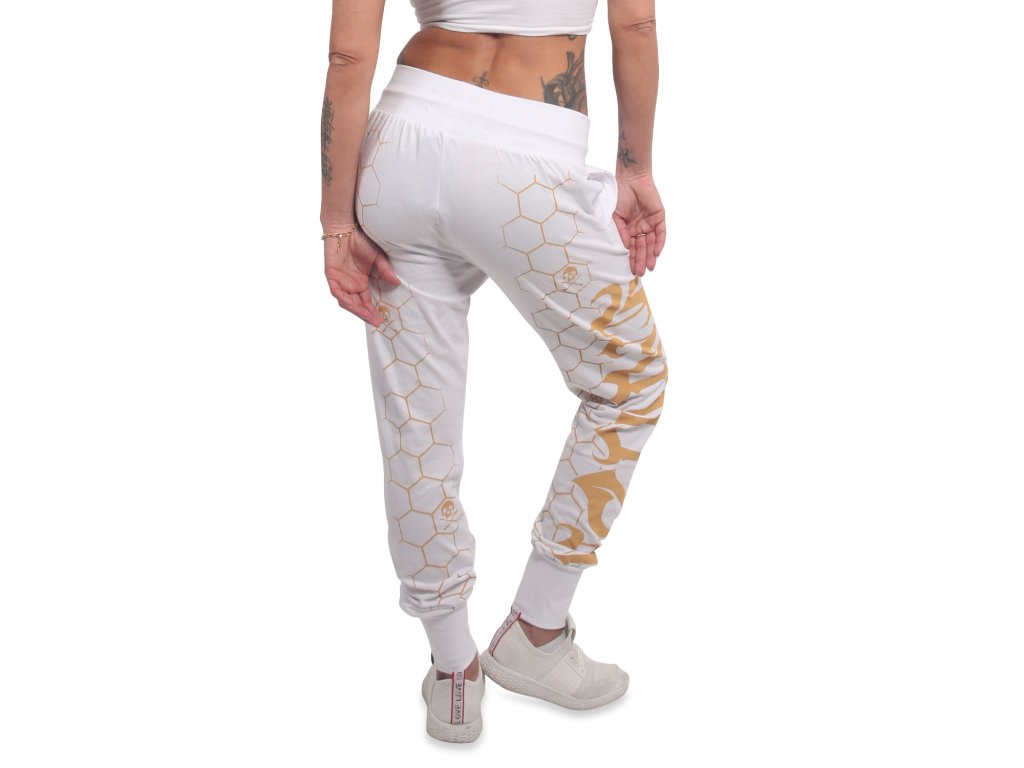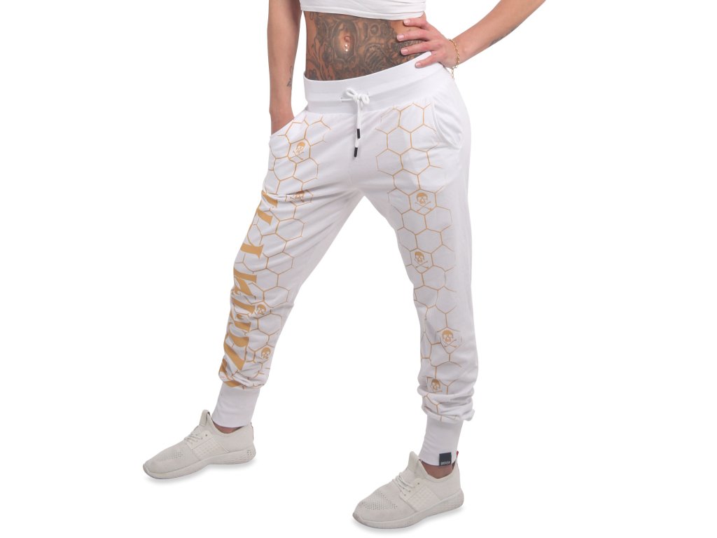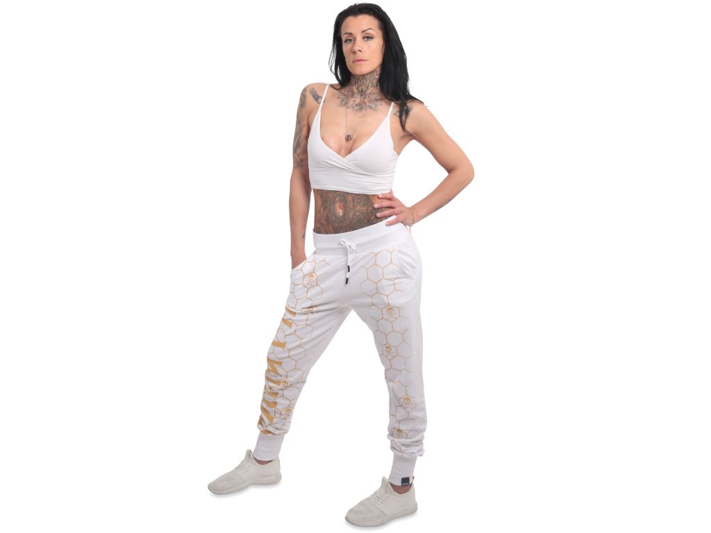 Dámské tepláky Yakuza Honeycomb Lite 22144 v bílé barvě. Tepláky mají zlatý potisk, široké manžety a dvě kapsy. Sportovní střih, lehký žerzejový materiál. Tepláky jsou vhodné nejen na sportovní aktivity, ale udělají dobrý dojem i v běžném životě a ve volném čase.