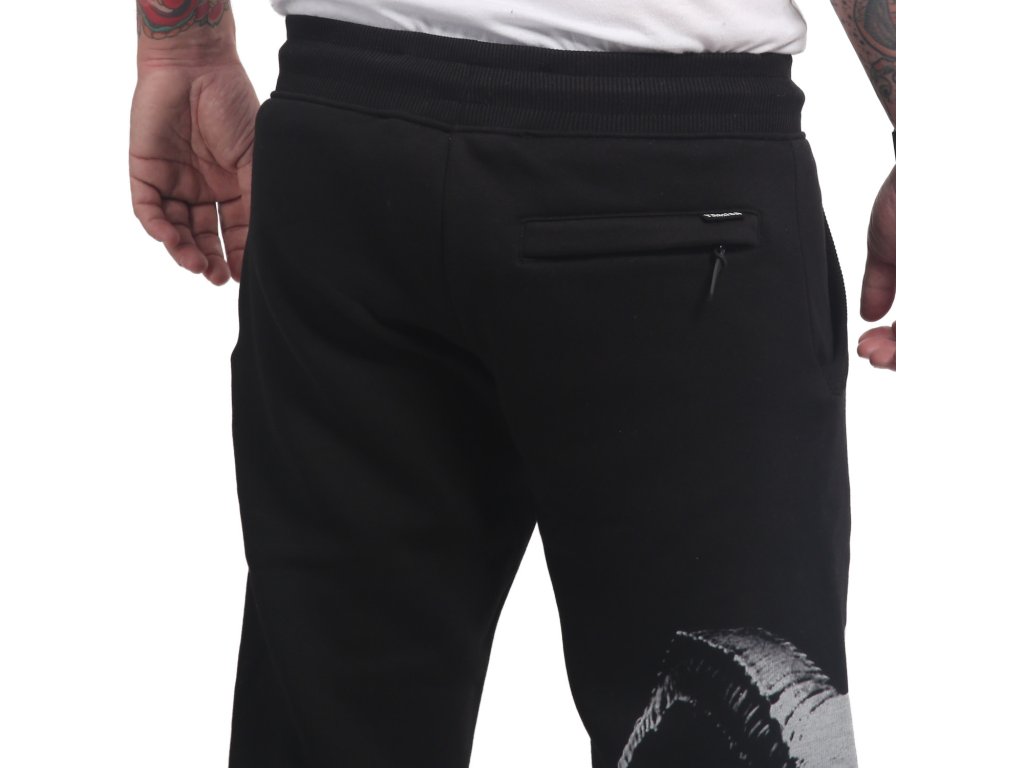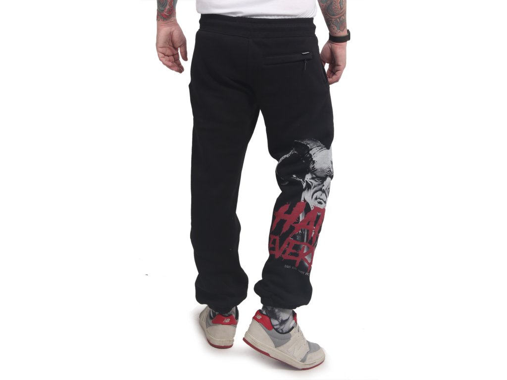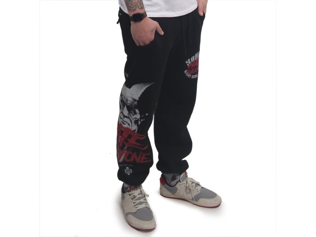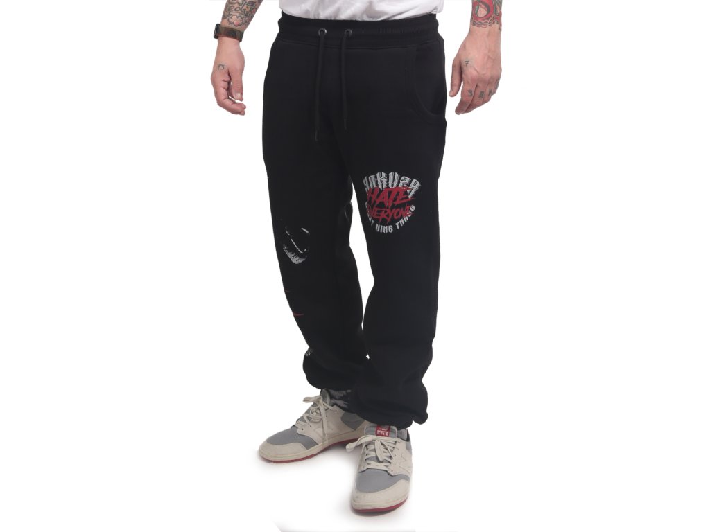 Pánské tepláky Yakuza Hate Loose 23051. Černé tepláky s potiskem na obou nohavicích, s bočními kapsami a se zúženým kotníkovým lemem.