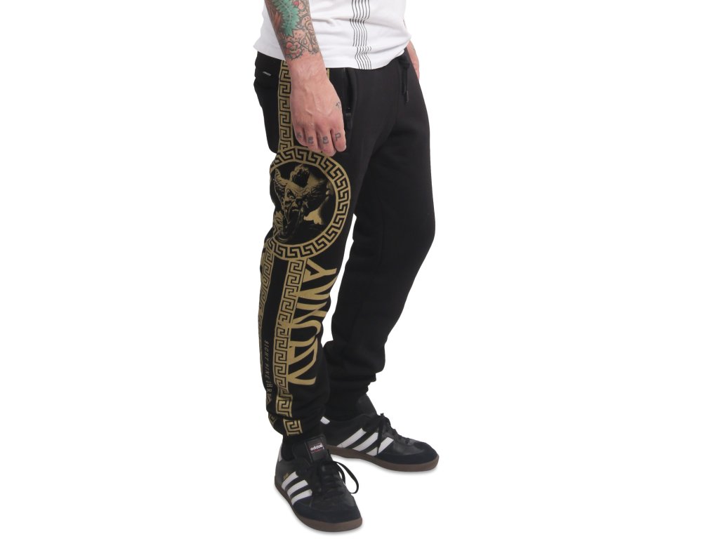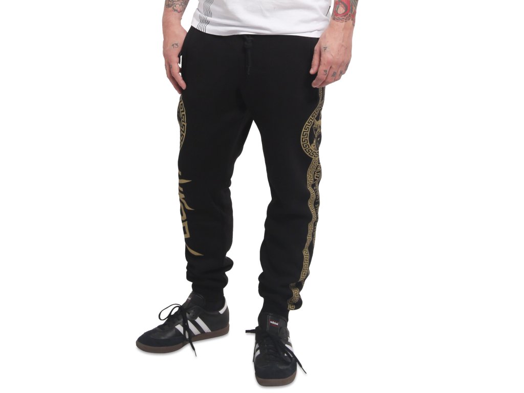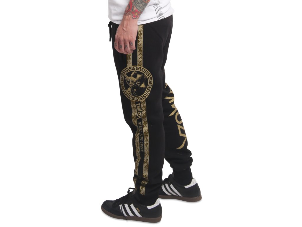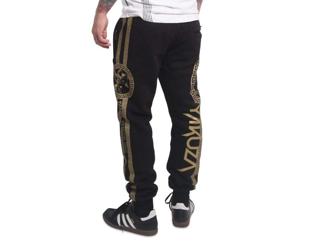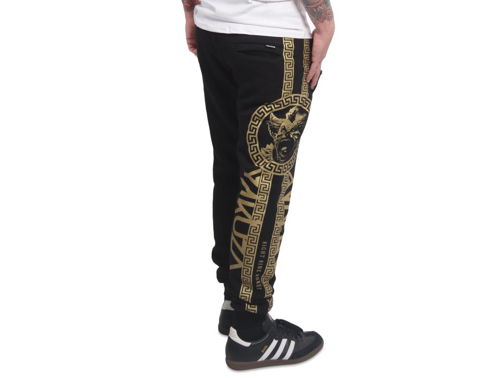 Pánské tepláky Yakuza VIP Team 23063. Černé tepláky se zlatým potiskem na obou nohavicích, s kapsami na zip a se zúženým kotníkovým lemem.