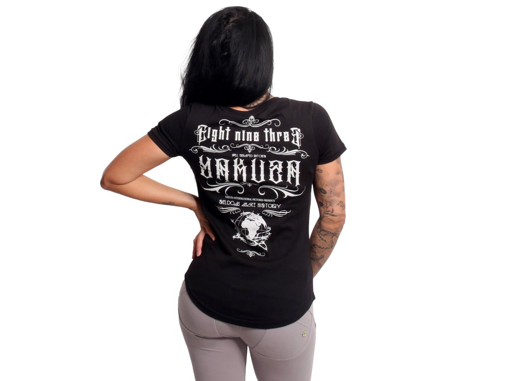 Dámské triko Yakuza Flower Style Curved V Neck 19121. Černé triko s barevným potiskem ve volnějším a prodlouženém střihu a s V výstřihem.