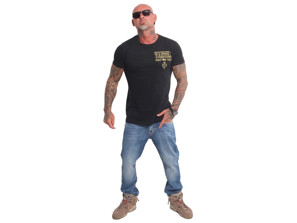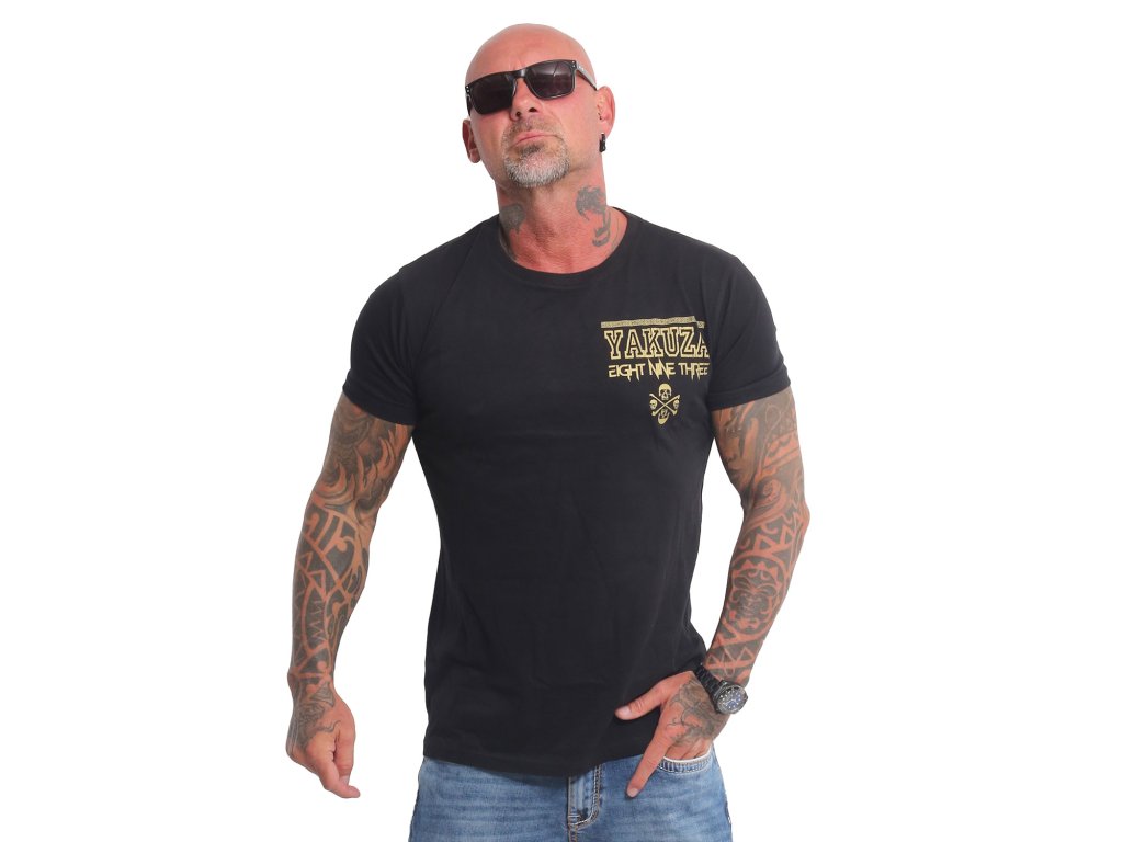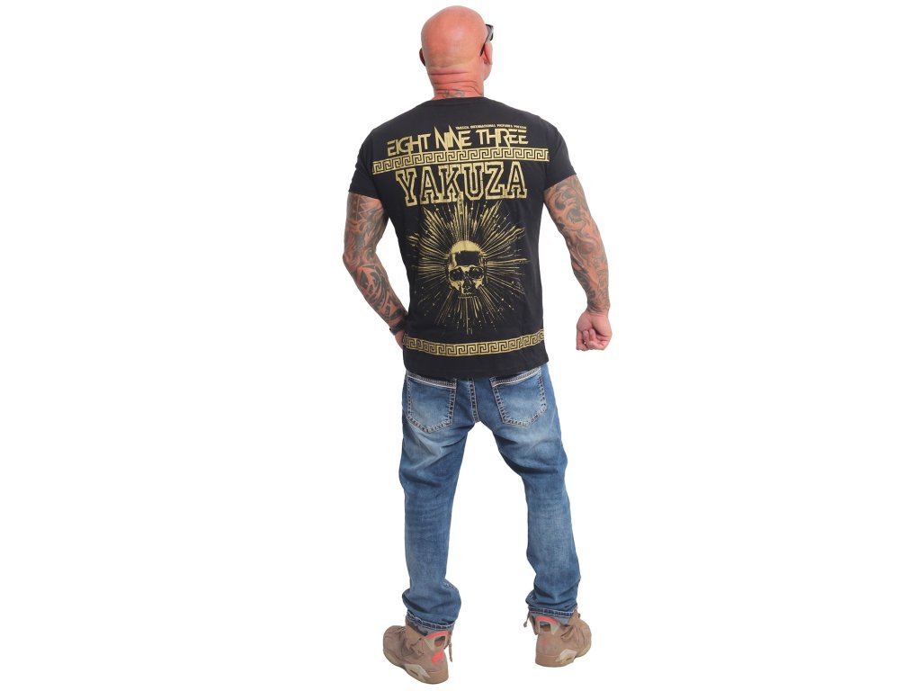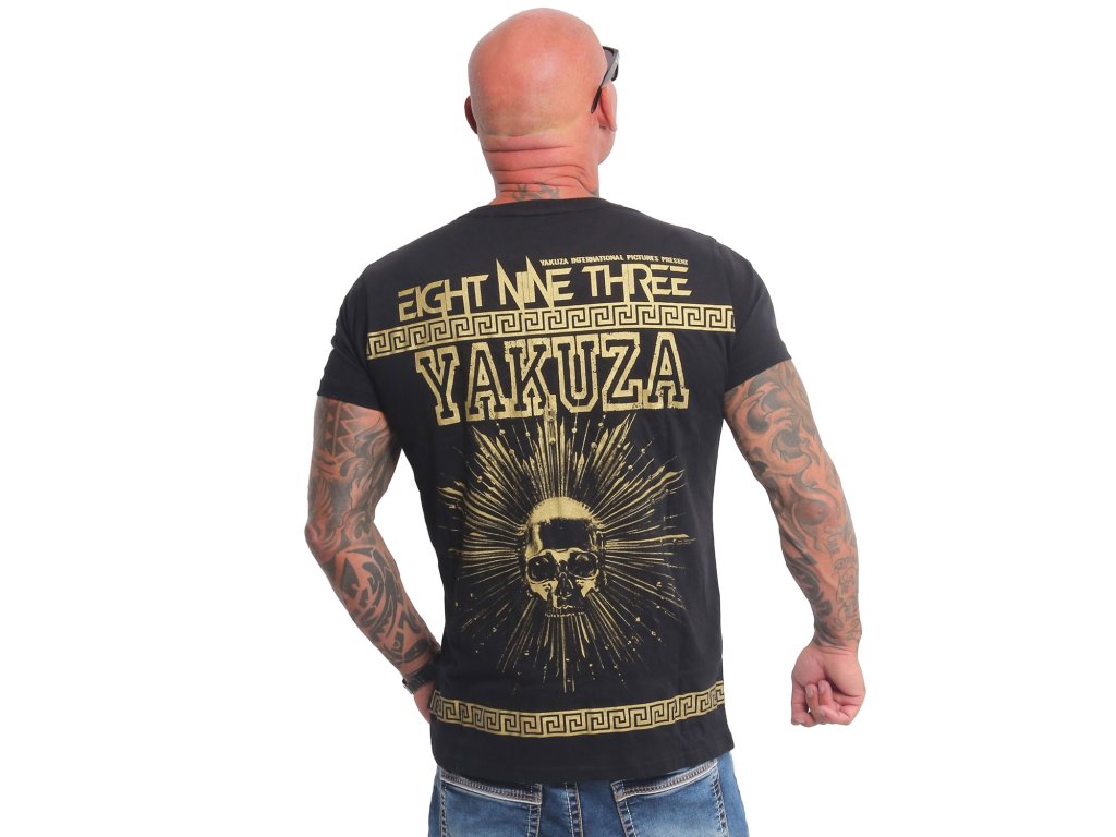 Pánské triko s krátkým rukávem Yakuza VIP Aztecs 23066. Černé triko s kulatým výstřihem a zlatým potiskem na zadní straně, samozřejmostí je štítek s logem Yakuza na bočním švu.