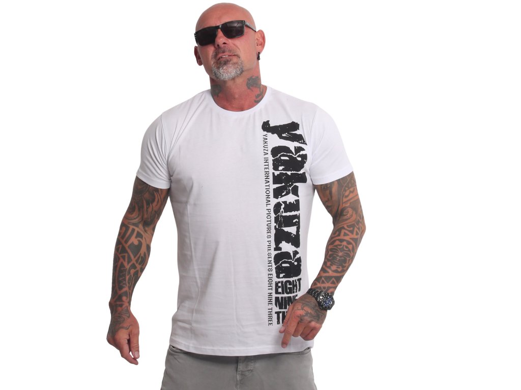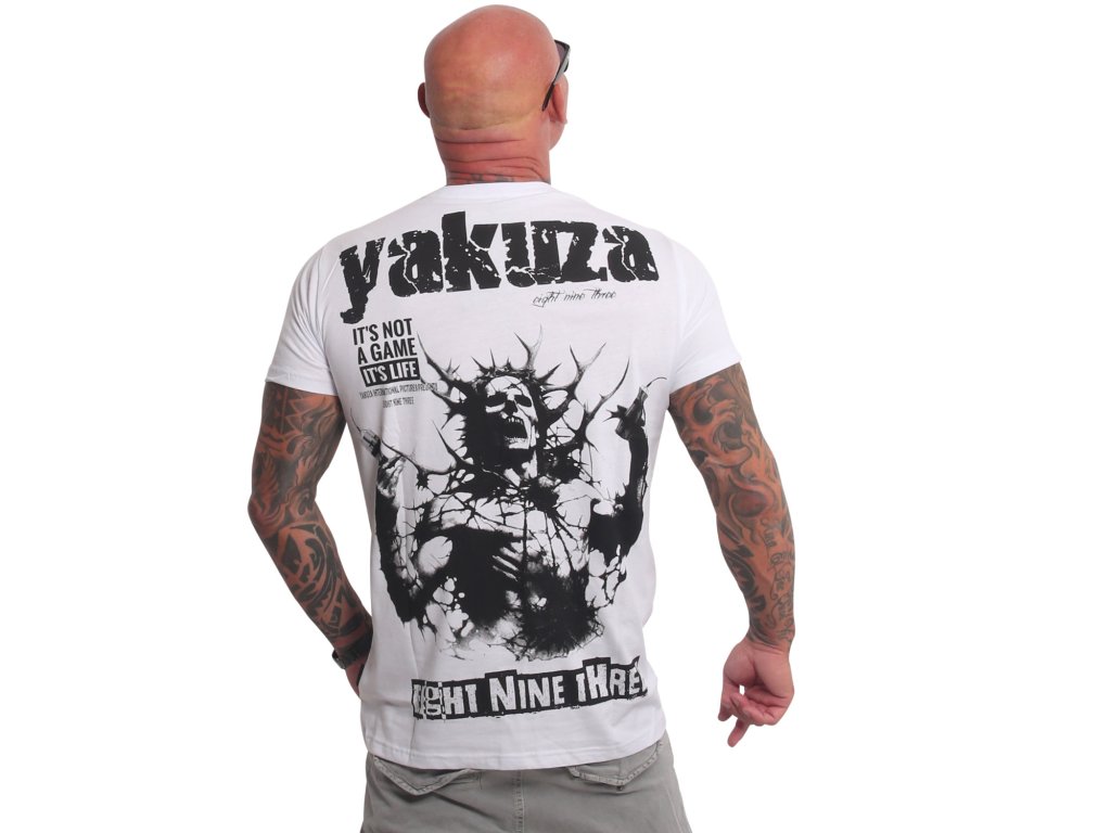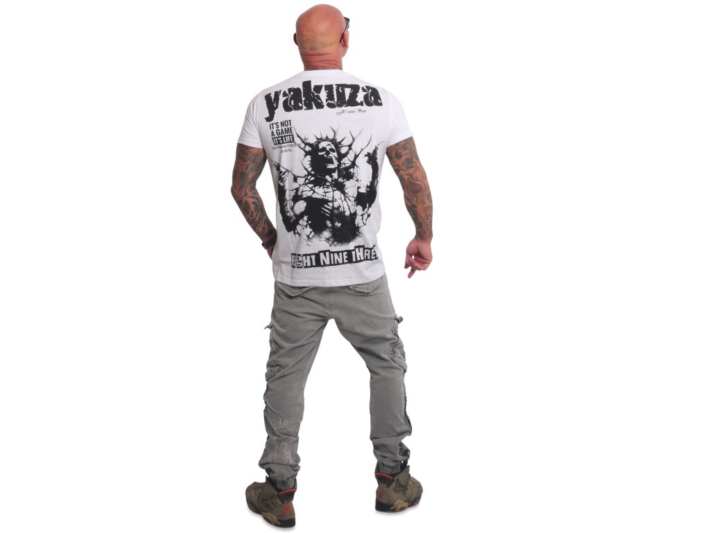Pánské triko Yakuza Dynamite 25016. Bílé triko s kulatým výstřihem a černým potiskem, samozřejmostí je štítek s logem Yakuza na bočním švu.