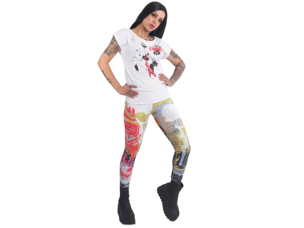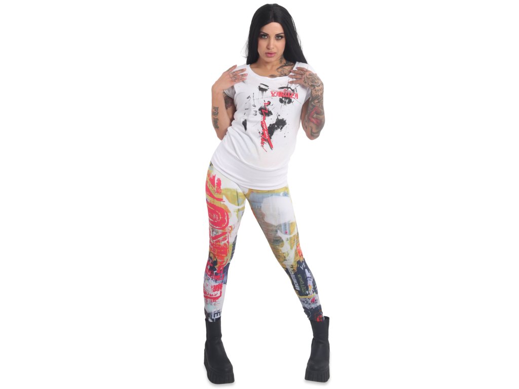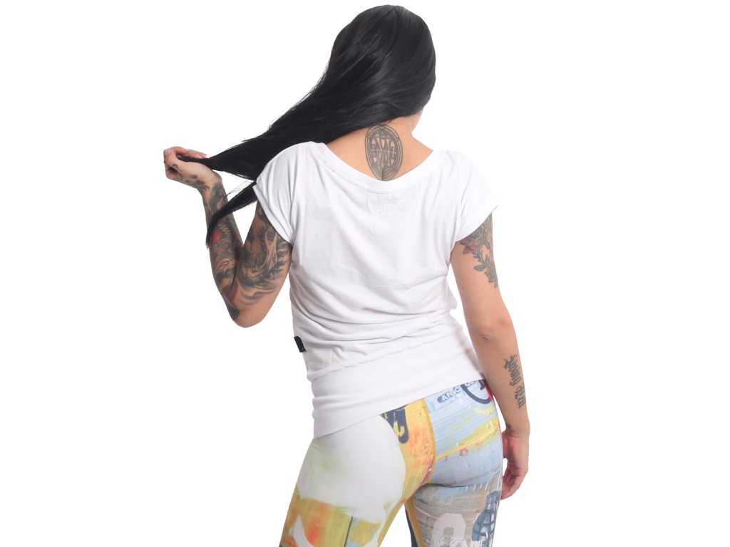 Dámské triko Yakuza Red Nose Wide Crew Neck 90126 s krátkým rukávem. Bílé dámské triko s potiskem na přední straně má zúžený vysoký lem kolem pasu, zadní strana je čistá bez potisku.