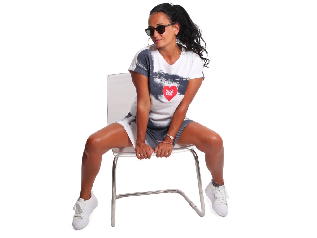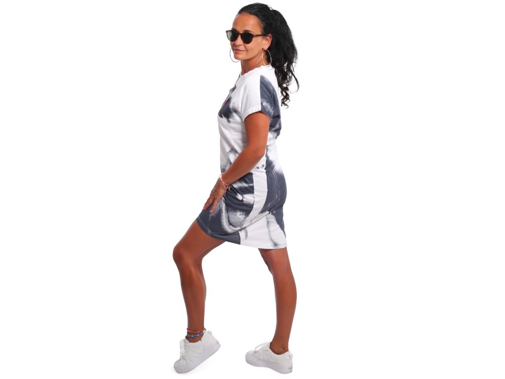 Prodloužené triko/šaty Yakuza Flip 18128 s krátkým rukávem. Bílo-šedé triko/šaty, rovný střih, kulatý výstřih a délka do půlky stehen.