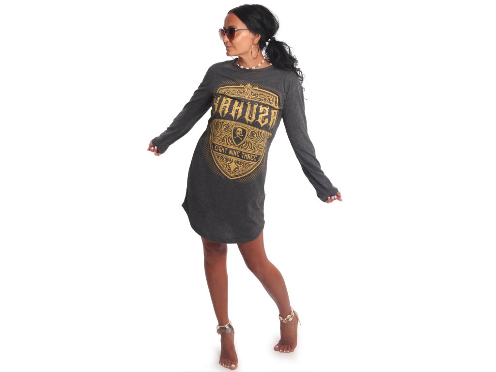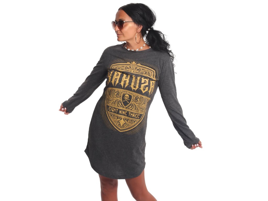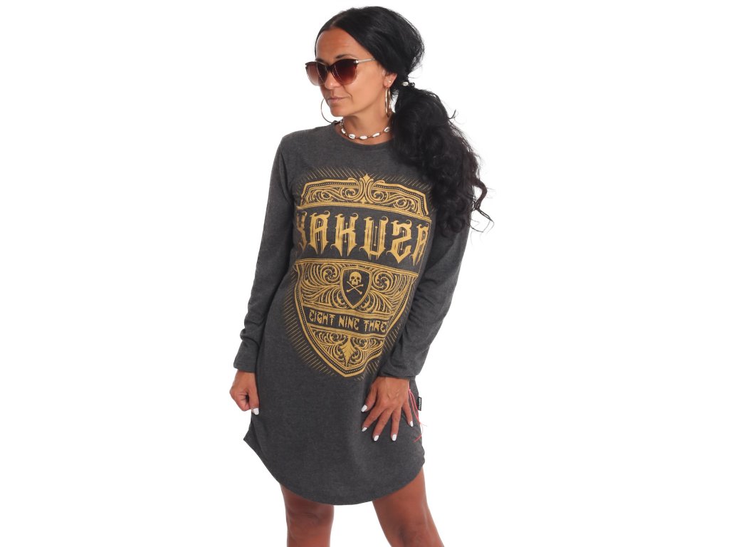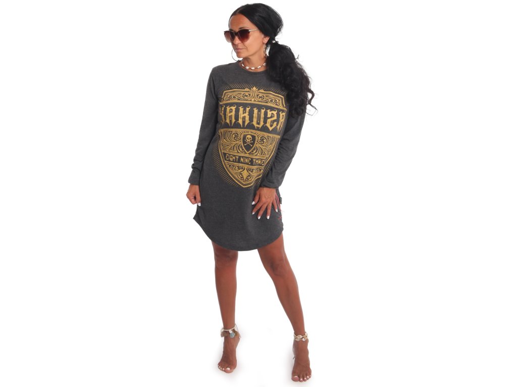 Dámské prodloužené triko/šaty Yakuza Plain 22113. Šaty v šedé barvě mají dlouhý rukáv, žlutý potisk na přední straně a prodloužení spodní strany.